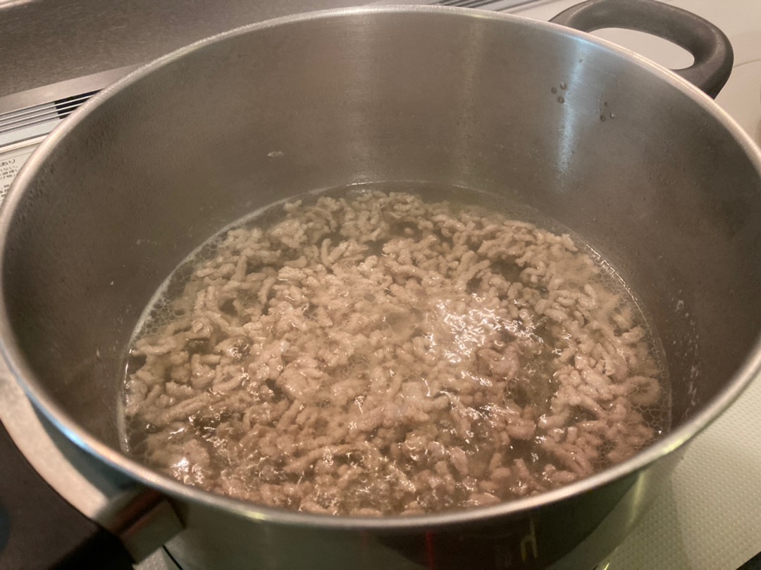 だしを取った中にすりおろししょうがとミンチを入れ、アクを取り除きます~^^