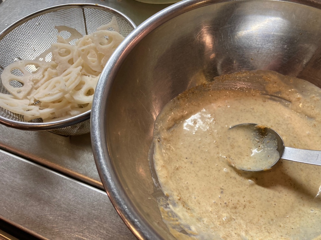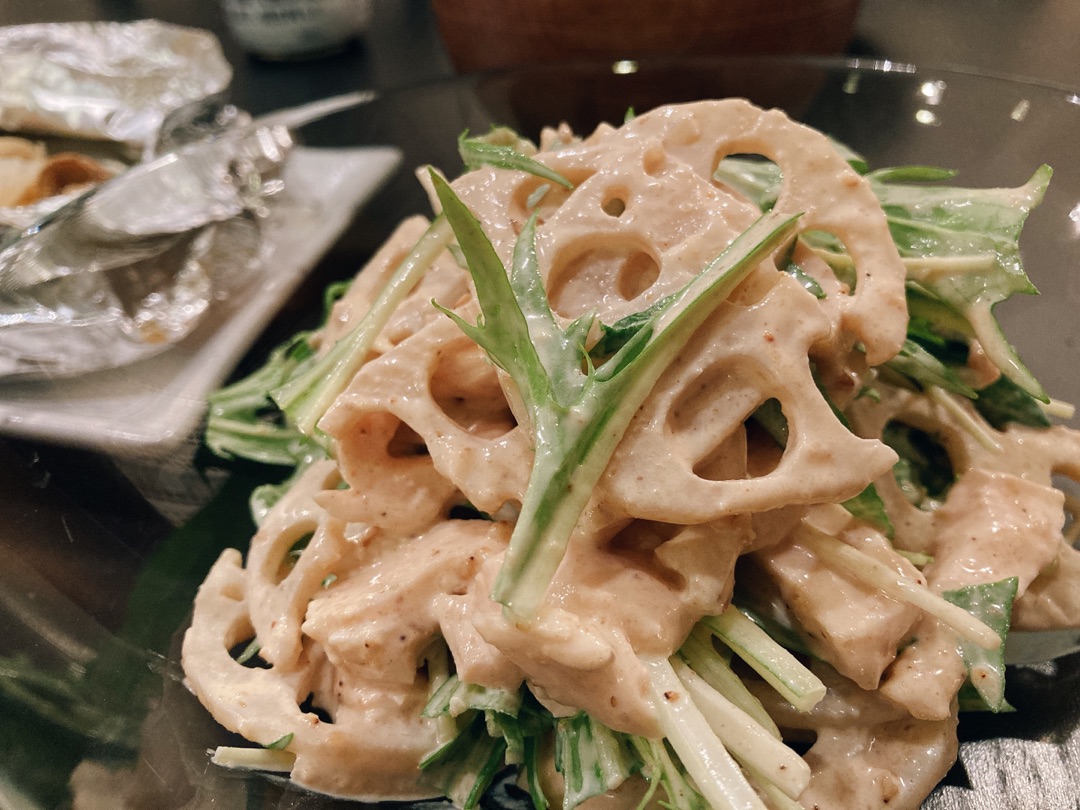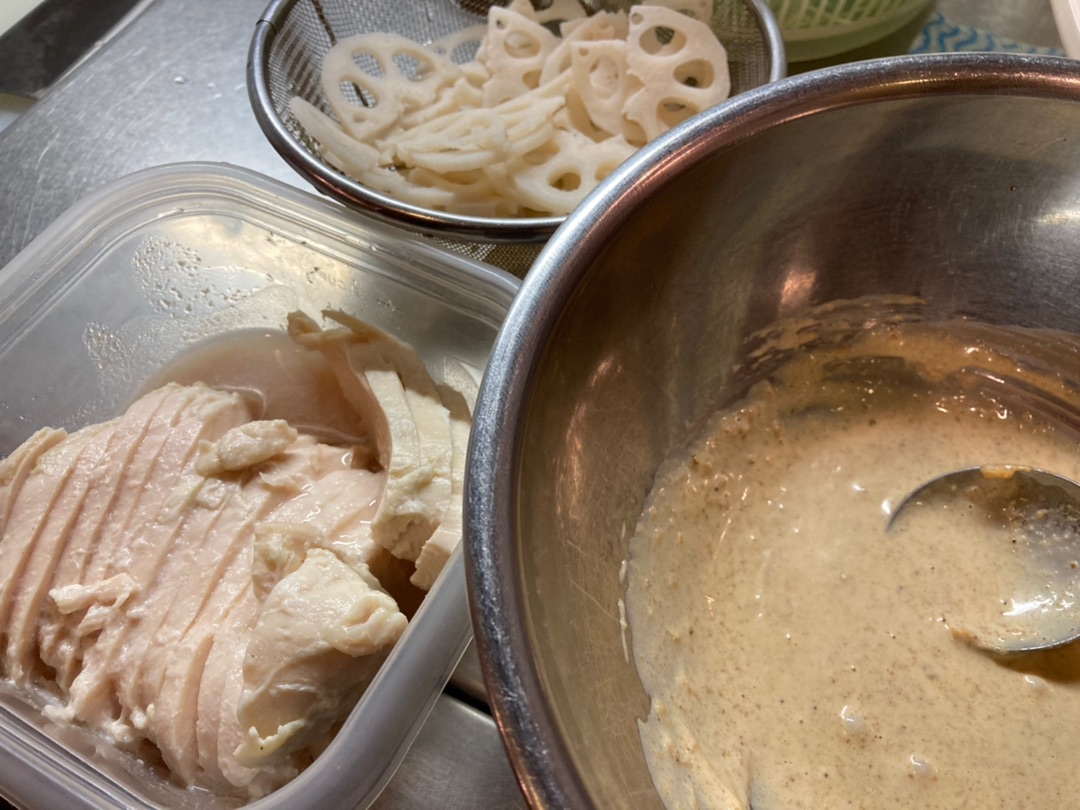 メインがあっさりなので副菜②もちょっとこってり系ソースのサラダです^^ ピーナッツバター&マヨネーズ&めんつゆ&牛乳などで作ったソースに・・・ 作り置きのサラダチキンとさっとゆがいいたれんこんを・・・・ 投入ー!^^