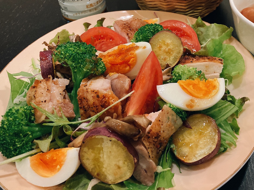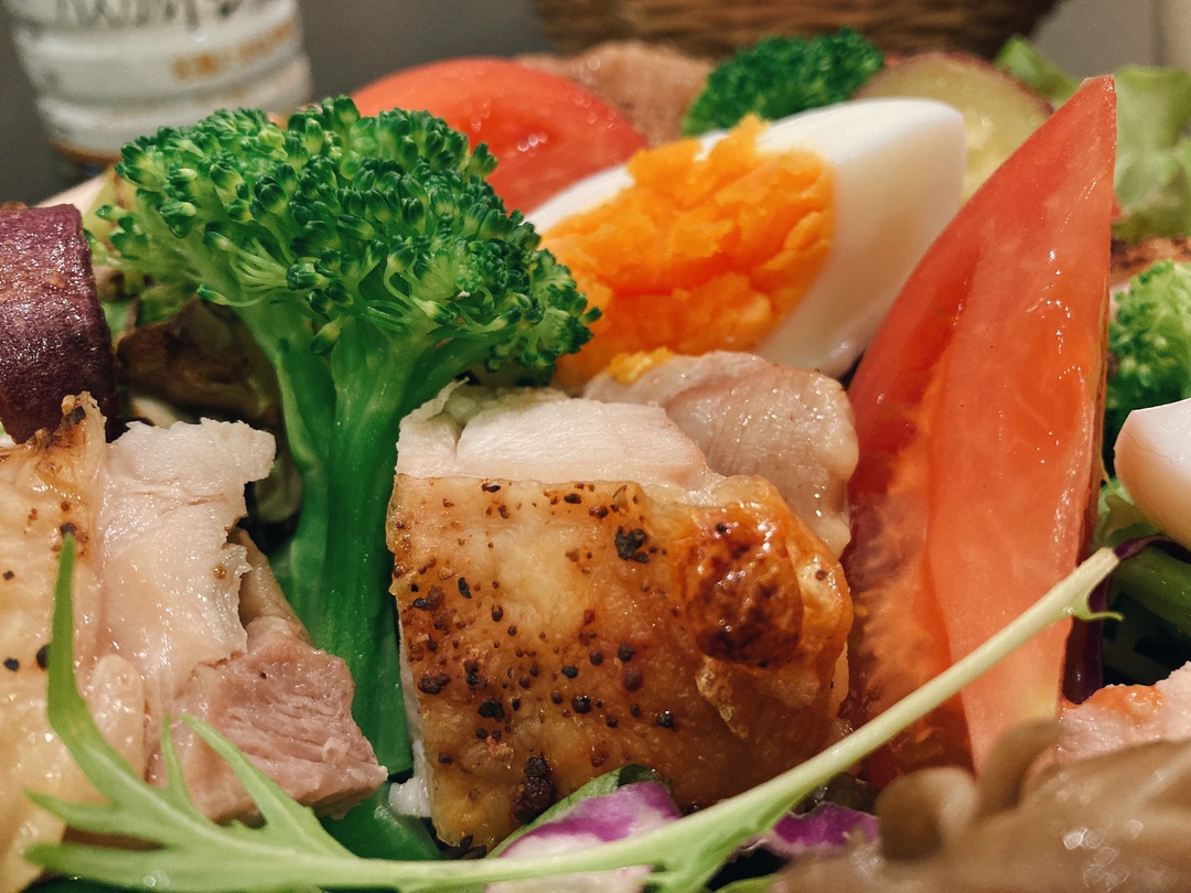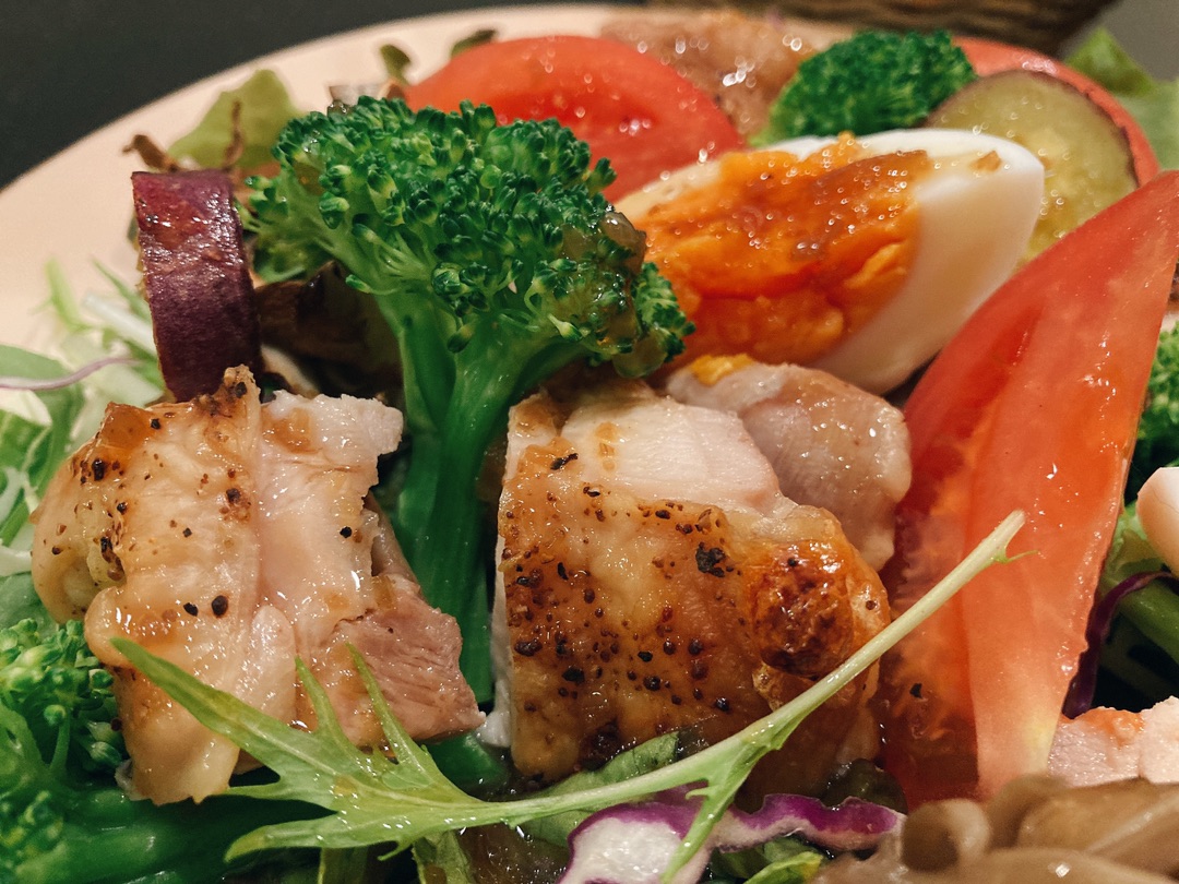 グリルチキン、ゆで卵、ブロッコリー、さつまいも、トマト、サニーレタス、水菜、キャベツ、紫キャベツ