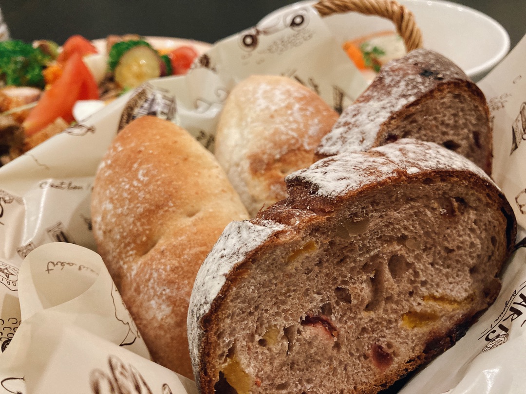 手作りパン2種(ライ麦粉パン、ドライフルーツのパン) 鶏もも肉の皮目にマキシマムをパラパラして魚焼きグリルで焼きました^^ 焼き上がってからチキンは一口大にカットして