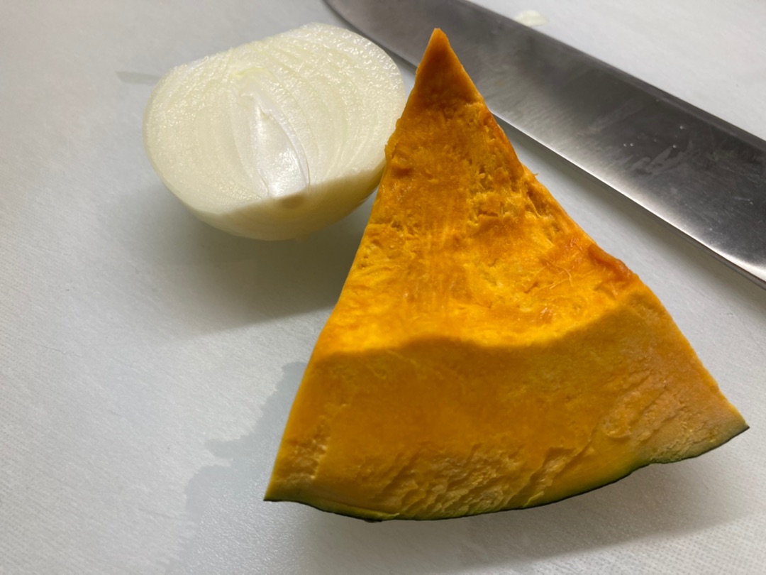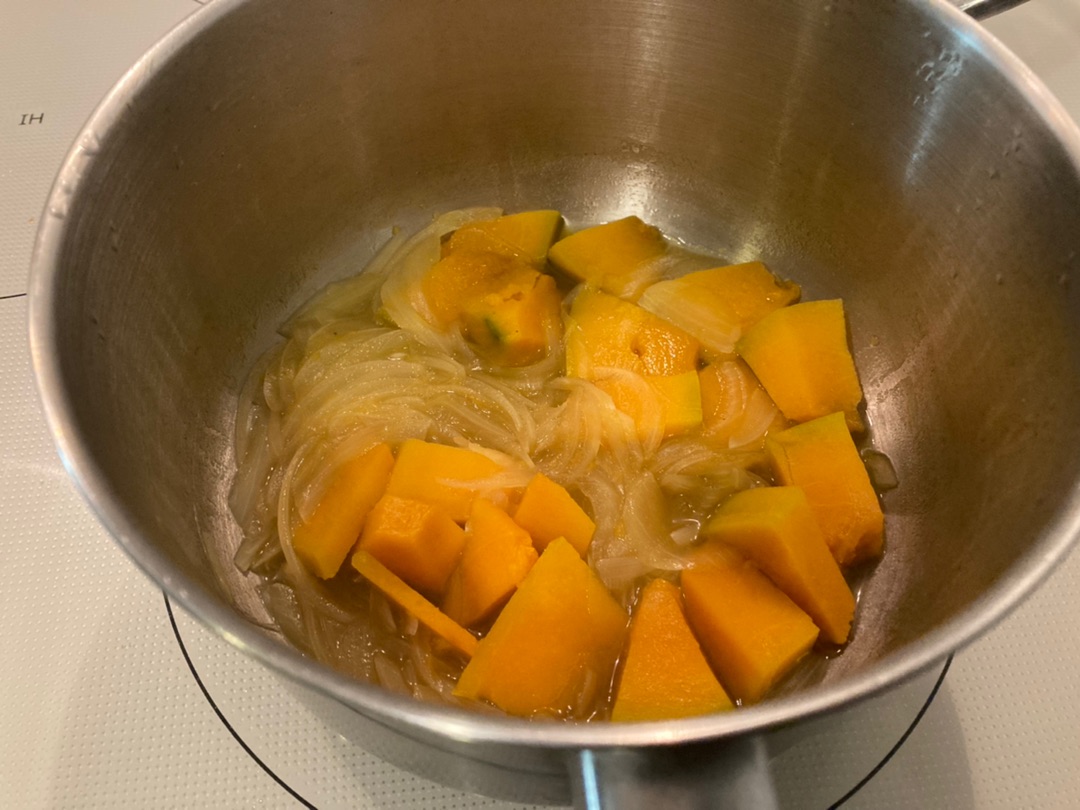味付けはコンソメの塩気とカボチャ&玉ねぎの甘みだけでおいしいスープになりました![]()
