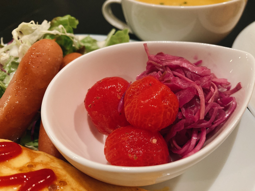肉っぽいものがなかったのでウインナーも立派なおかずに!(笑) 先日作った紫キャベツとプチトマトのマリネの作り置き・・・