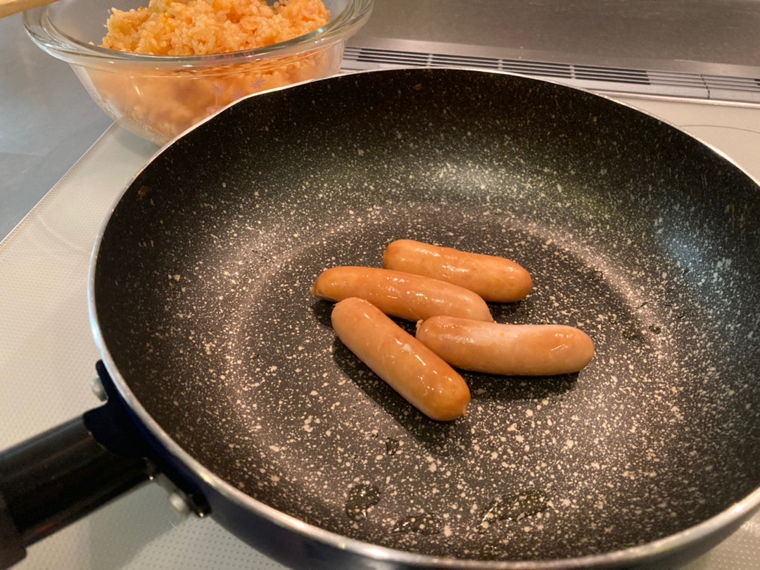 チキン入ってないけど!笑 ケチャップライスは一旦ボウルに取り出してペーパーでフライパンをさっと拭いてからウインナーを炒めます^^