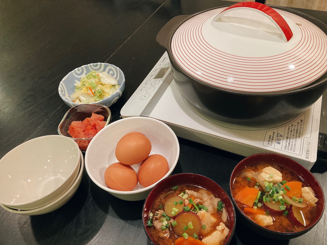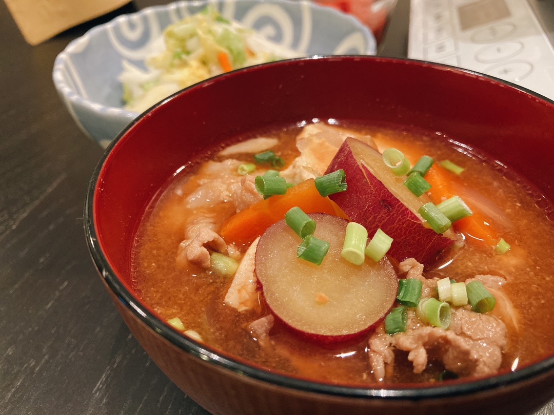 大根、にんじん、豚肉、玉ねぎ、さつまいもで具だくさんなので豚汁は我が家ではおかず認定です