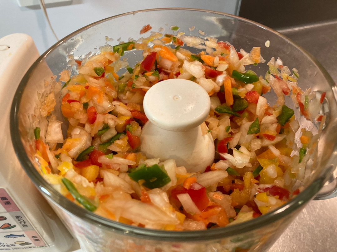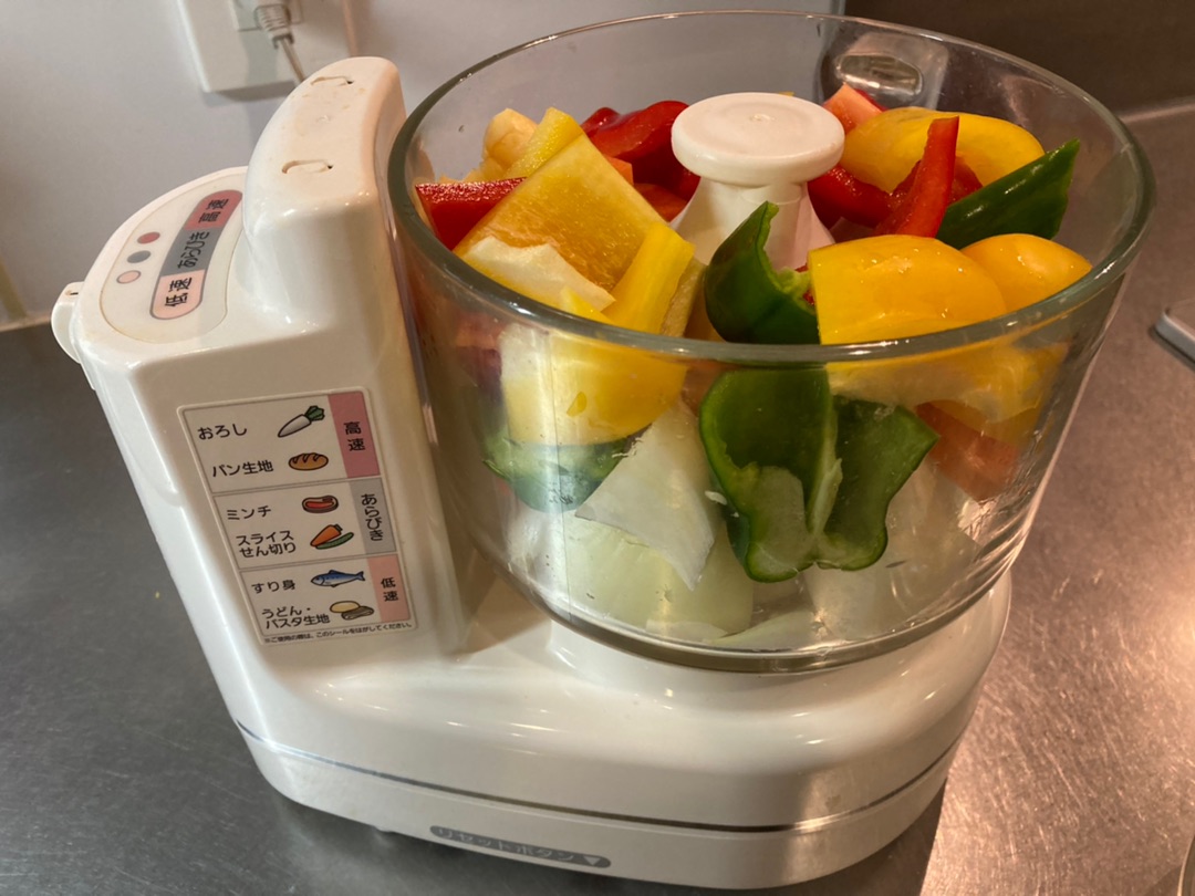 玉ねぎ、ピーマン、にんじん、パプリカを一口大にカットしてフードプロセッサーに入れて・・・