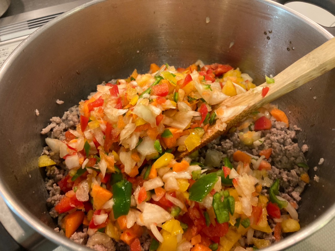 お肉の色が変わってきたらさっきの野菜のみじん切りを投入ー!^^