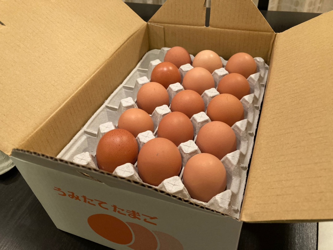 こちら、ブロ友・きょうこさんから昨日届いたうみたて卵なんですー!