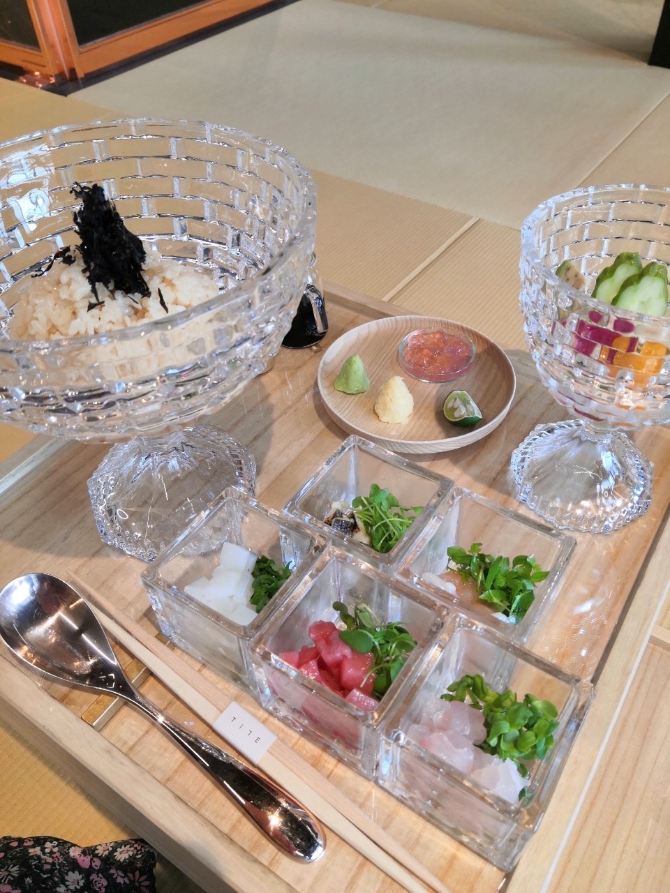 箱の中からお茶のセットが出てきておねーさんがお茶を入れてくれました^^ 私が選んだネタはこの5つ♪^^ ぬか漬けもオッサレー!(≧▽≦) 薬味はわさび、しょうが、ライムと、ピンクのは福井の梅ゼリーだそう