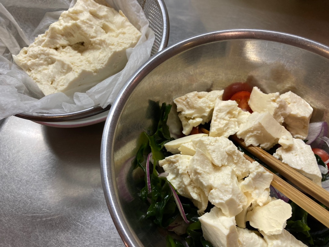 サラダはアボカドと豆腐、生わかめと赤玉ねぎ、プチトマトを和風ドレッシングでいただくサラダ。 豆腐は水切りして手で崩していれるとソレっぽくなります