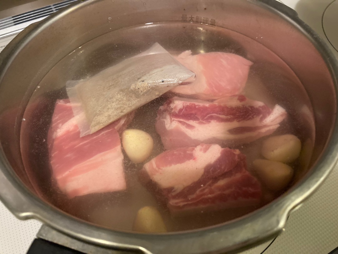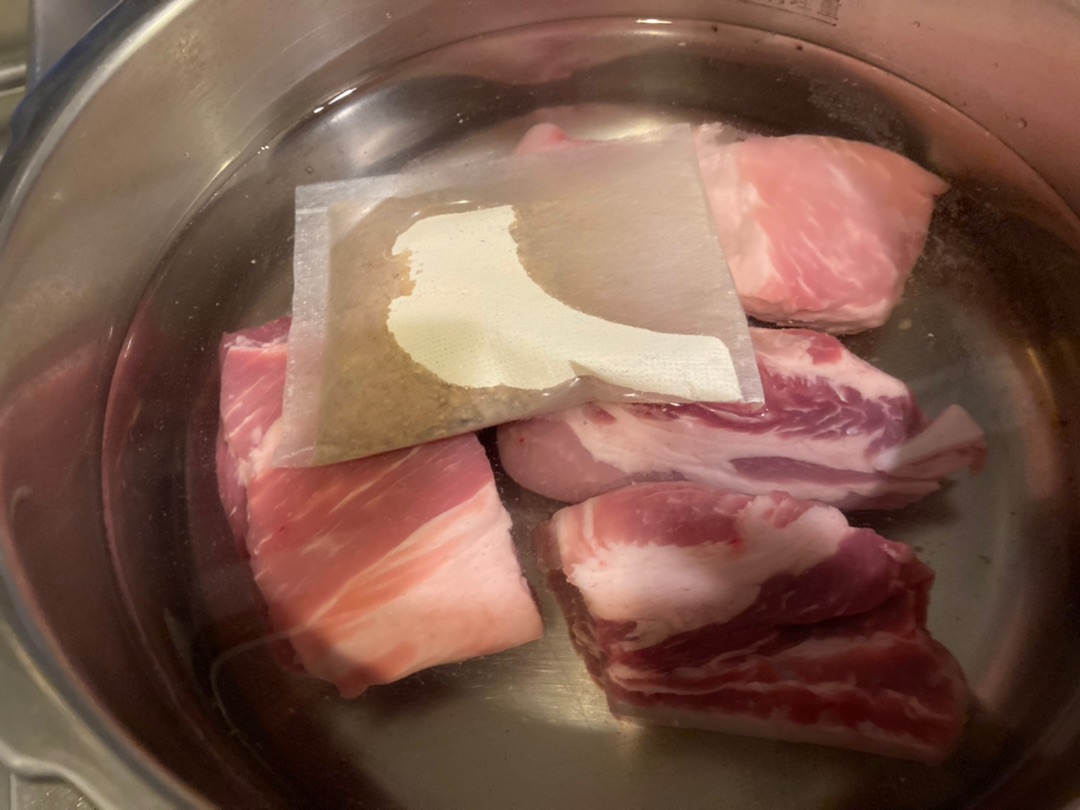 袋の中にはお茶パックみたいなのに入ったダシ?が入っていまして、これと水、さらにスペアリブ用のお肉を鍋に入れて・・・