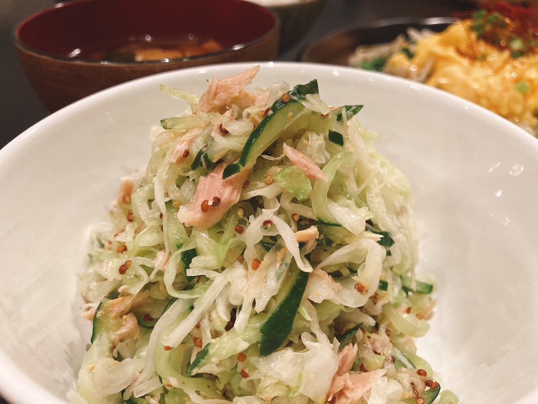 あとはマヨネーズを使わないさっぱりコールスロー♪^^ キャベツときゅうりの千切りにして塩もみをしてから、粒マスタードとオリーブオイル、レモン汁、ツナを入れます