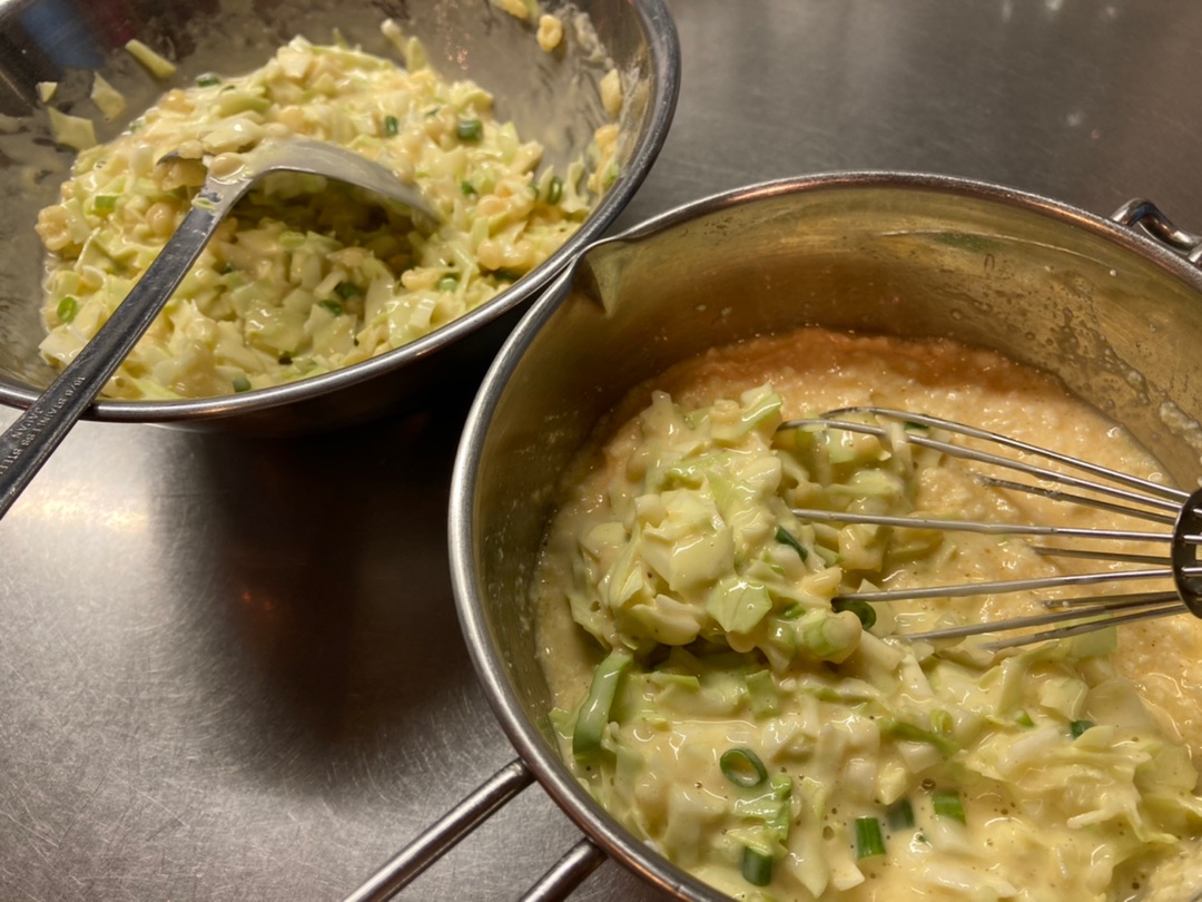 そこに普通のお好み焼き用に作った生地(キャベツ、ねぎ、天かすなど入ったもの)を通常の半分ぐらい入れます~♪^^