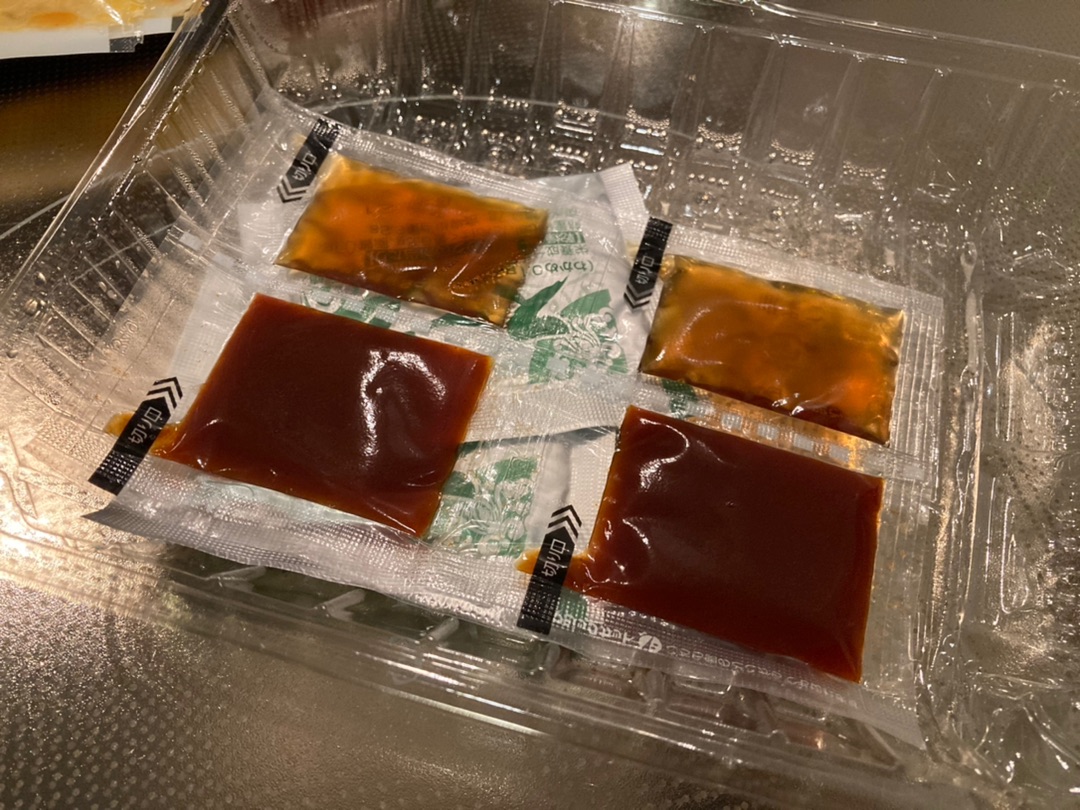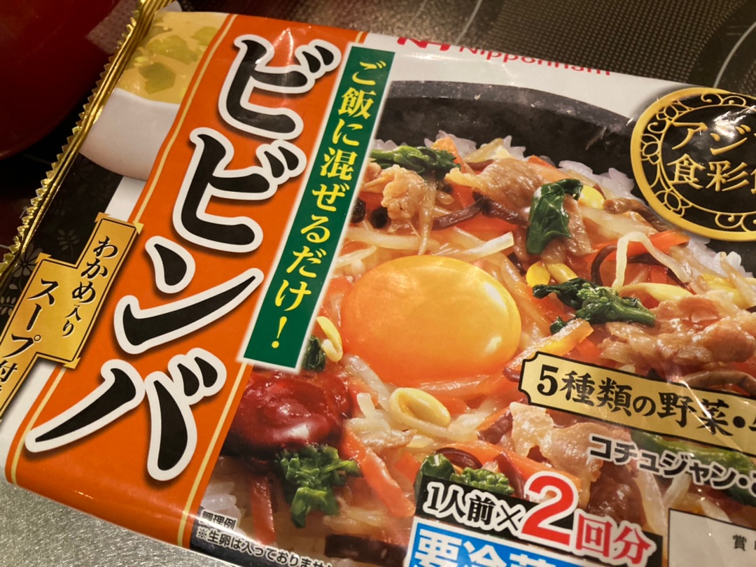 ついてきた調味料(ごま油・コチュジャン)をかけて・・・ テーブルに運んでから余熱でまぜると卵がいい感じに