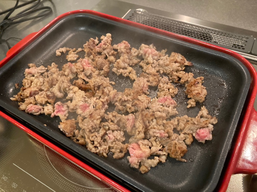 牛バラの細切れ肉にごま油、しょうゆ、みりん、すりおろしニンニク&しょうがをもみ込んで味付け焼肉っぽくした肉を・・・