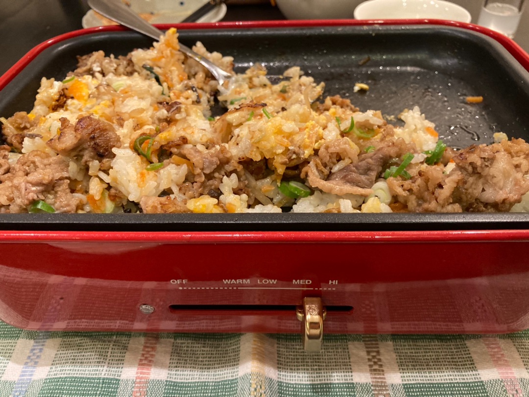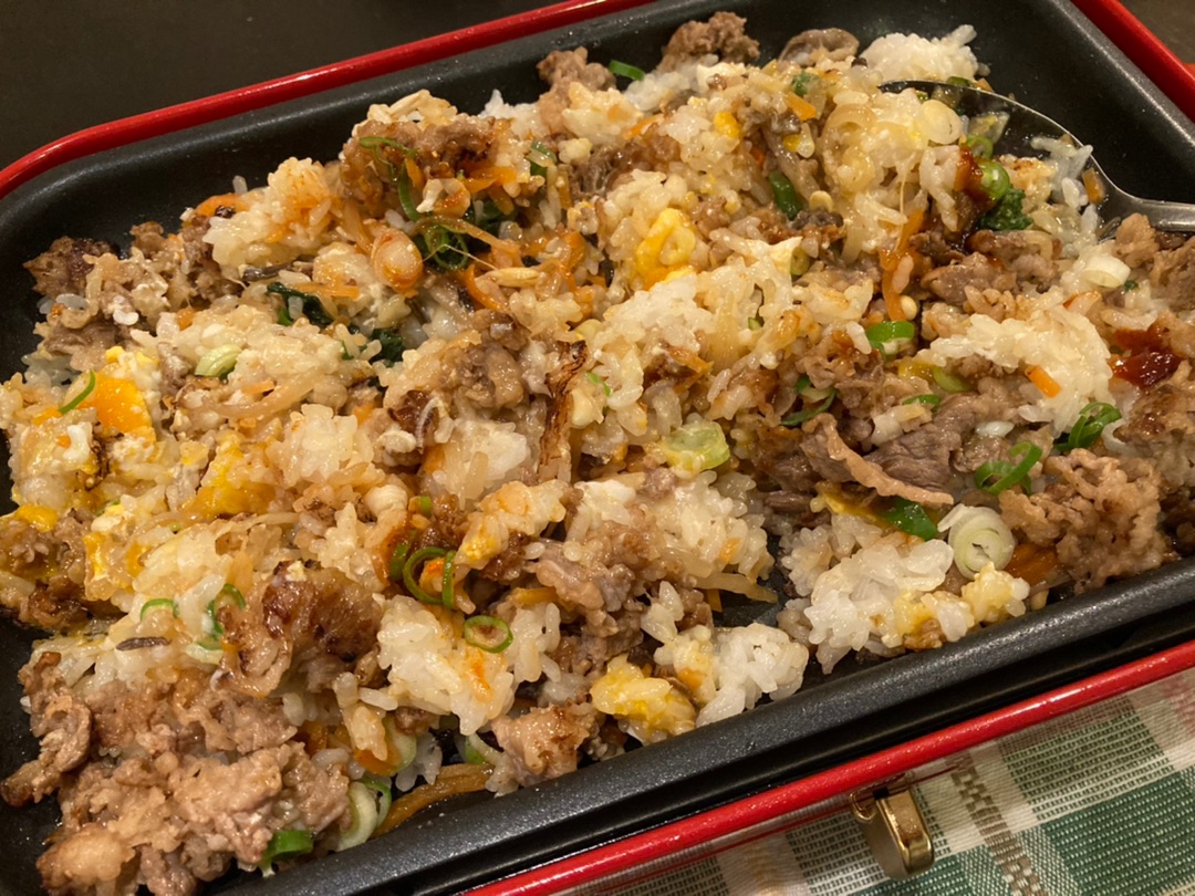 お肉の脂が出ているところへごはん、退避させたお肉、ビビンバの素、真ん中辺に卵を割って・・・