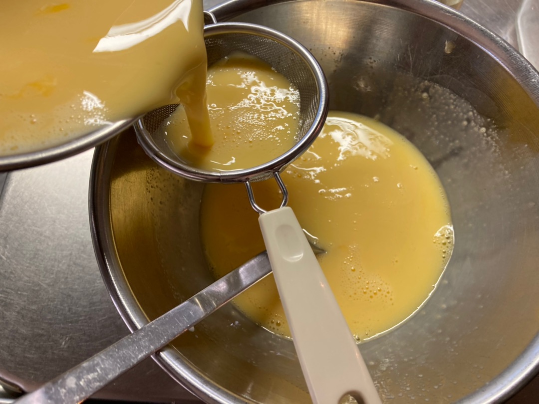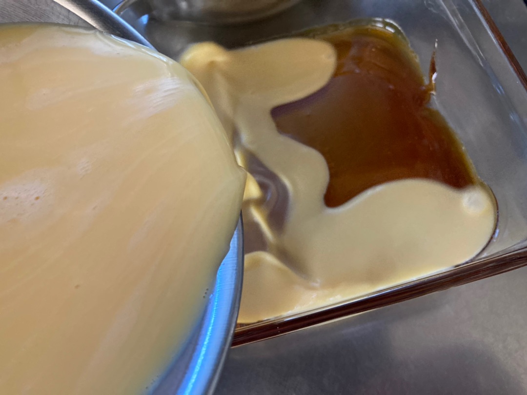 ここに温めた牛乳(砂糖入り)を加えてよく混ぜてからさっきのカラメル入れた型に流し込みます~![]()