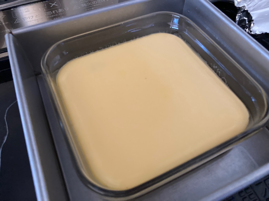 アルミホイルでフタをしてお湯を張ったバットに入れて160度で35分焼きます^^