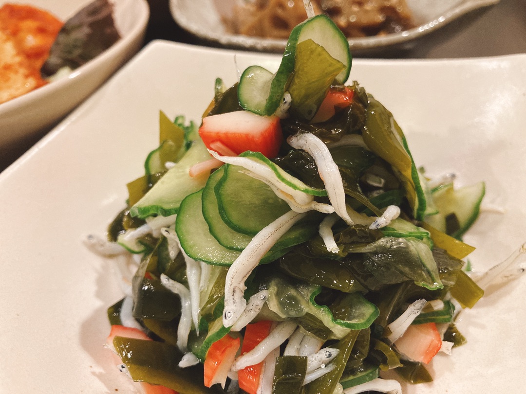 きゅうりと生ワカメ、しらす、カニカマの酢の物でした!