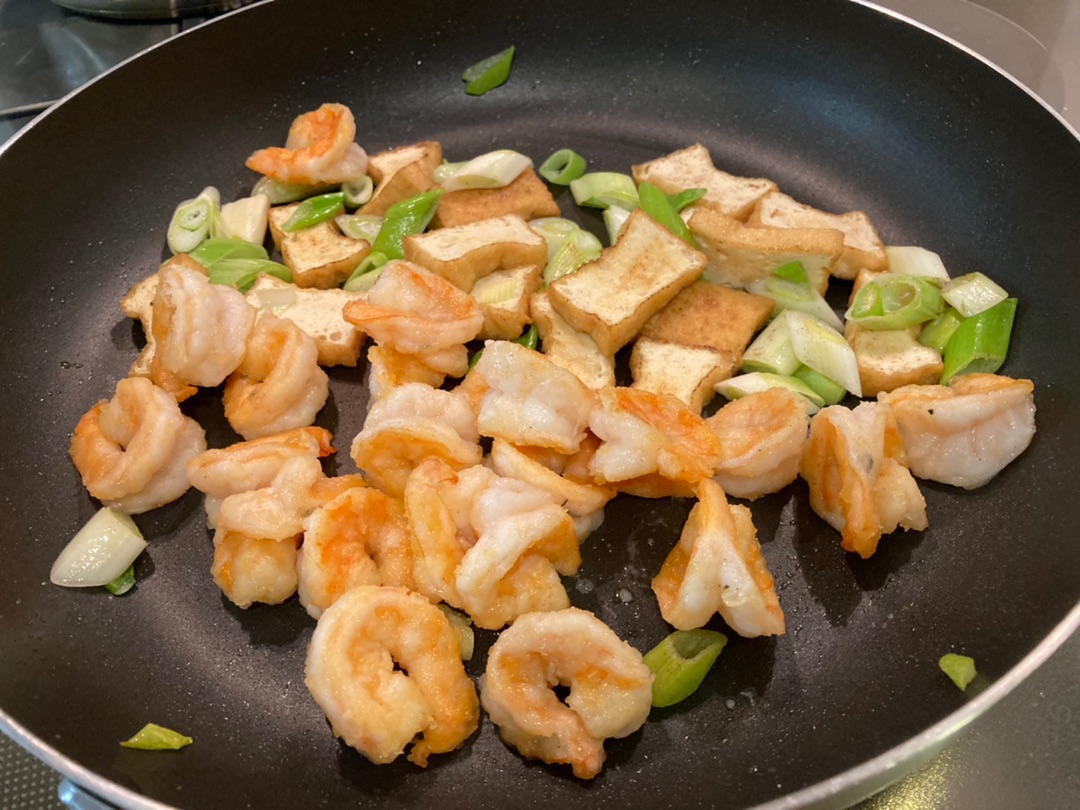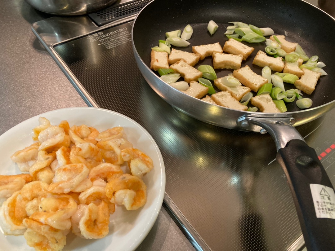 海老の色が変わったら一旦お皿に取り出して、厚揚げとねぎを炒めます~^^