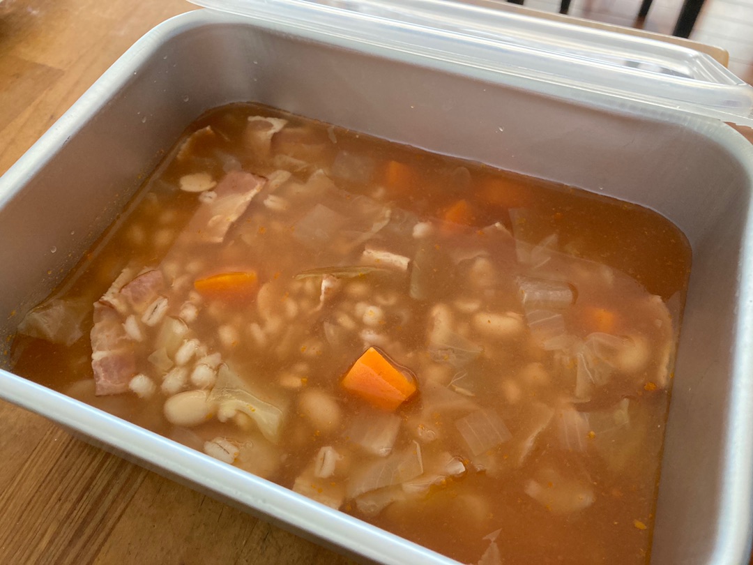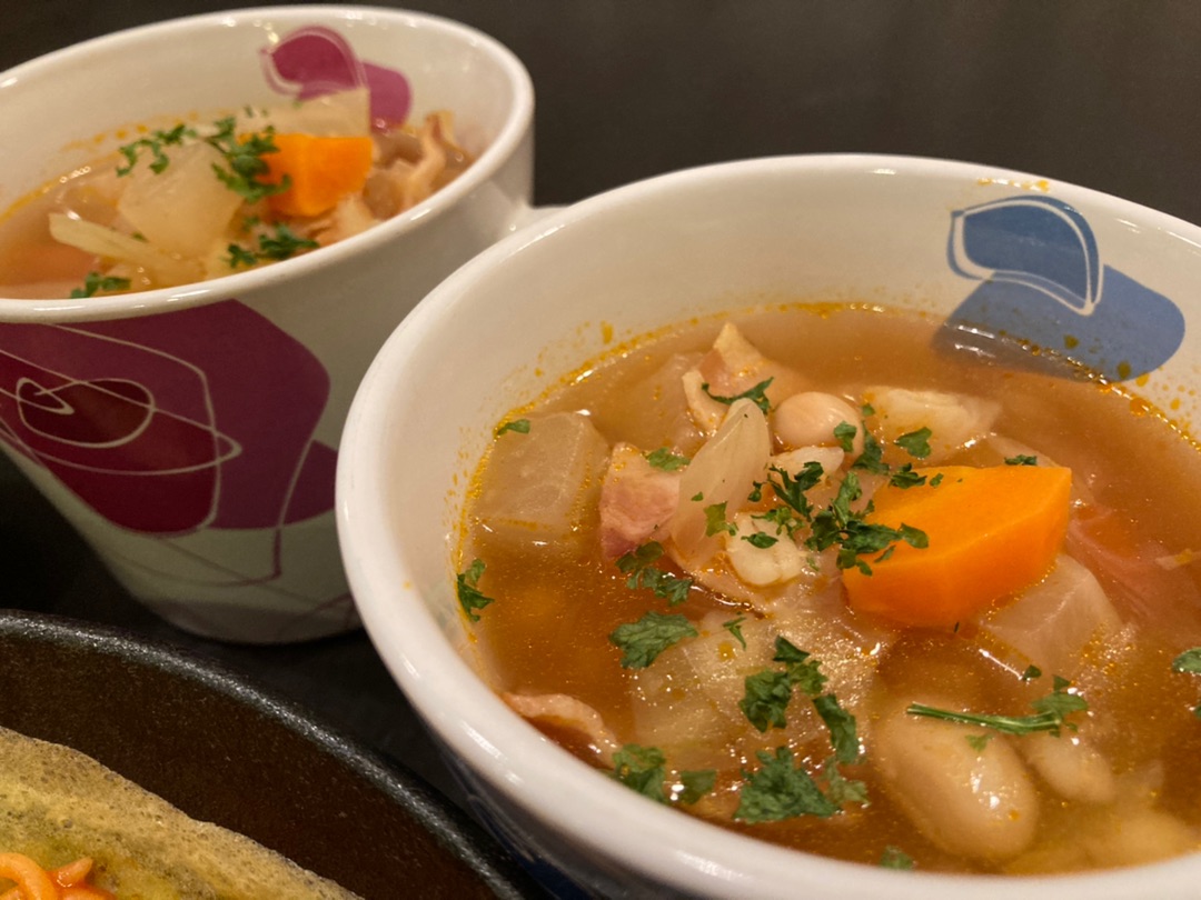 付け合わせのスープは野菜室の残り物で作ったスープ!^^ 玉ねぎ、にんじん、大根、キャベツは全て1㎝角にカット、あとはベーコン、冷凍してあった大豆、あともち麦も入れて・・・ 圧力鍋の「野菜」ボタンをスイッチオーン