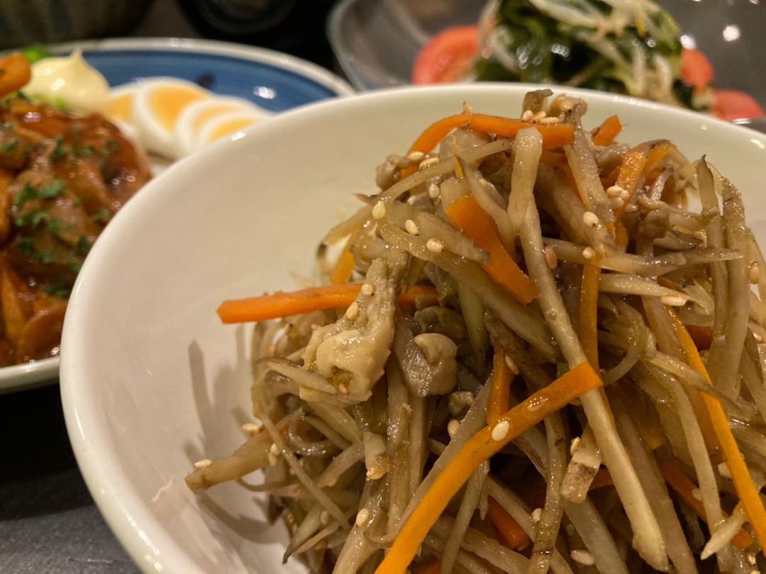 副菜は我が家の定番お惣菜のオイスターきんぴら。 そしてごぼうはなるべく細くカットするほうがおいしいです!^^