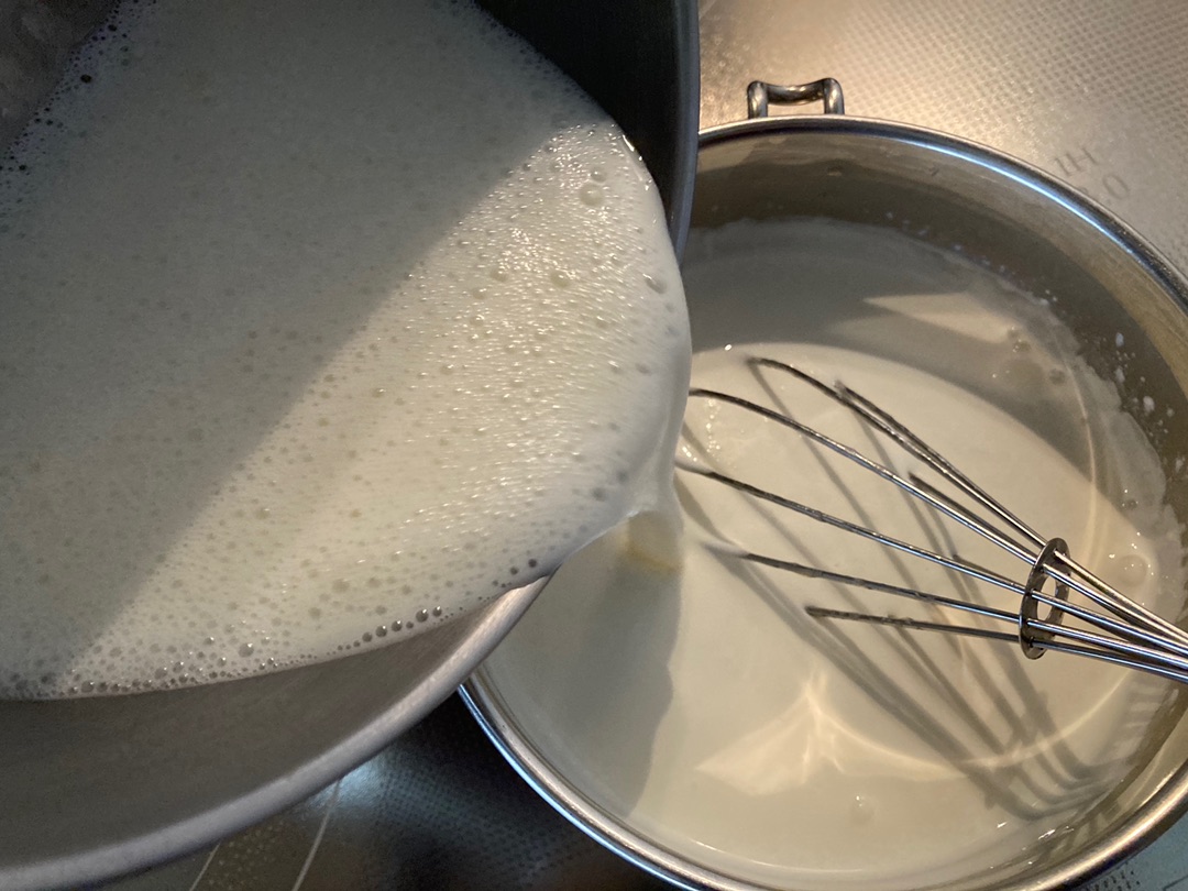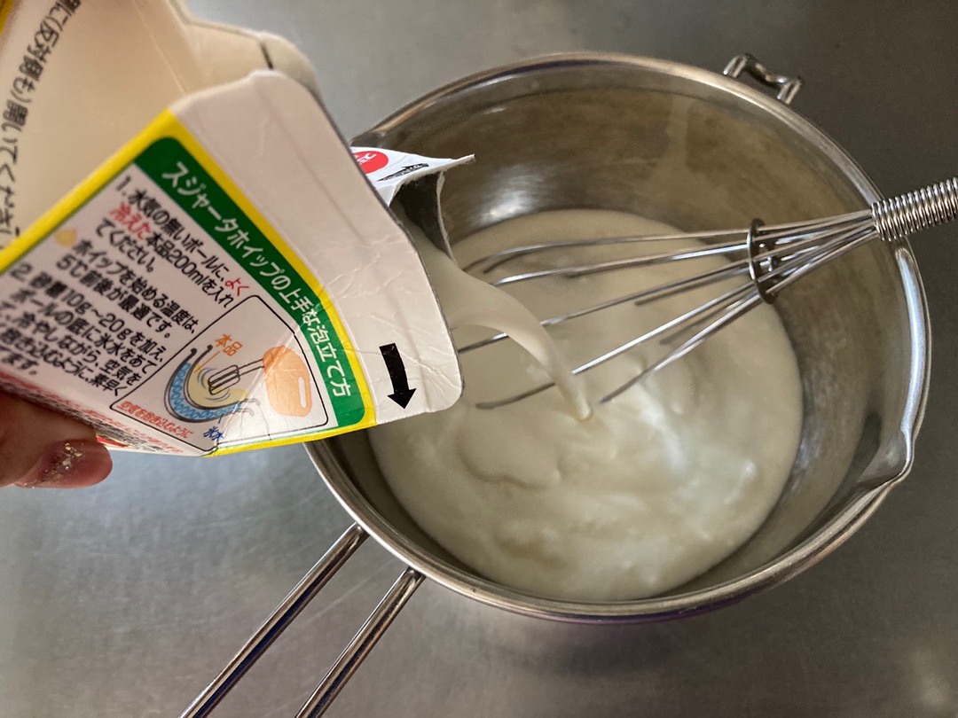 見てのとおり、ヨーグルト&生クリームのほうに牛乳を入れるので、ヨーグルトをまぜるボウルは最初から大きめにしておきましょう。