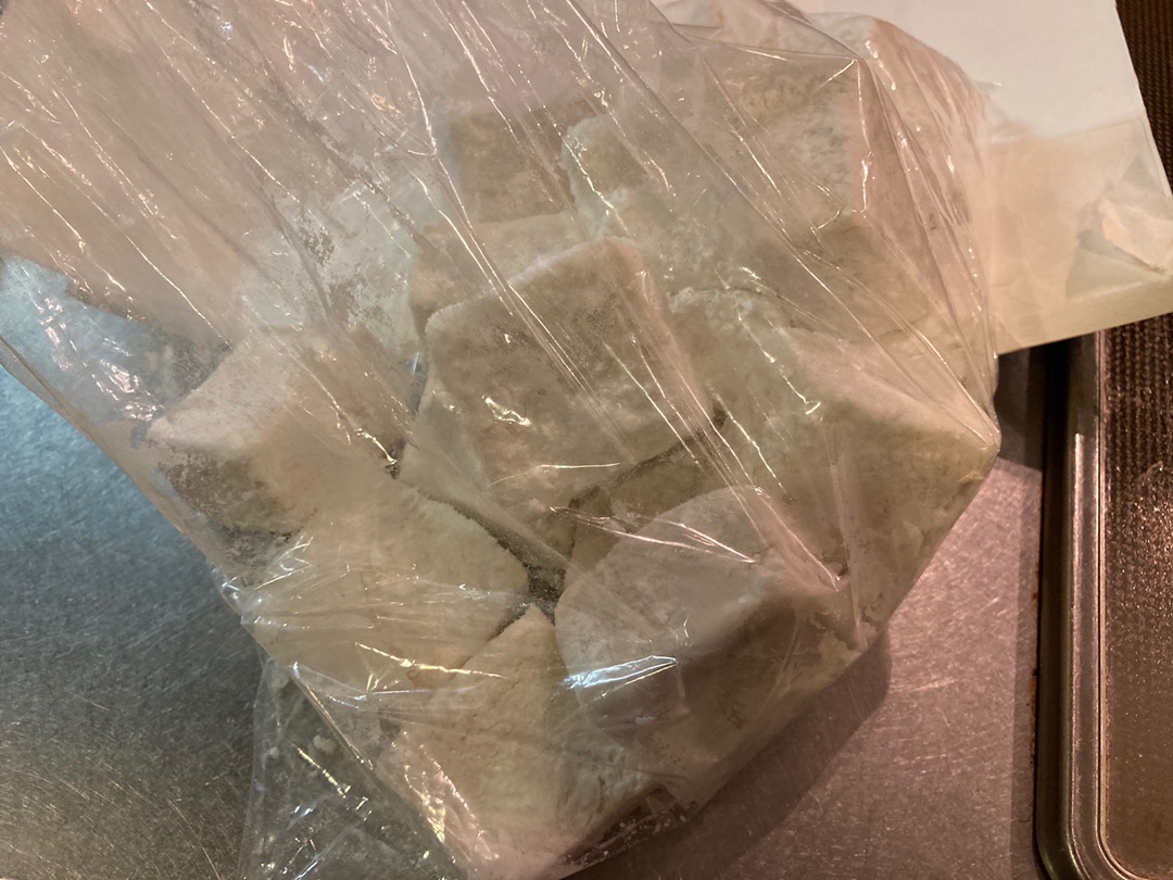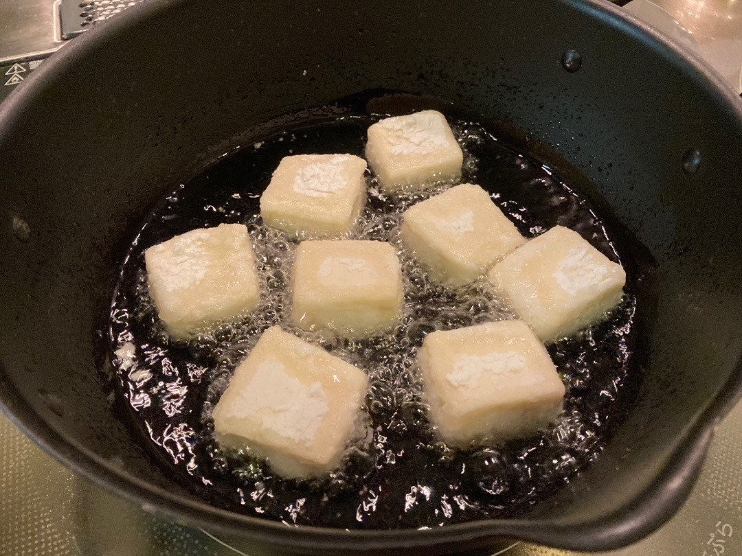 このときに片栗粉がついていない面があると高野豆腐が油を吸って出来上がりが油っぽくなってしまうので、必ず満遍なくつけてくださいね^^
