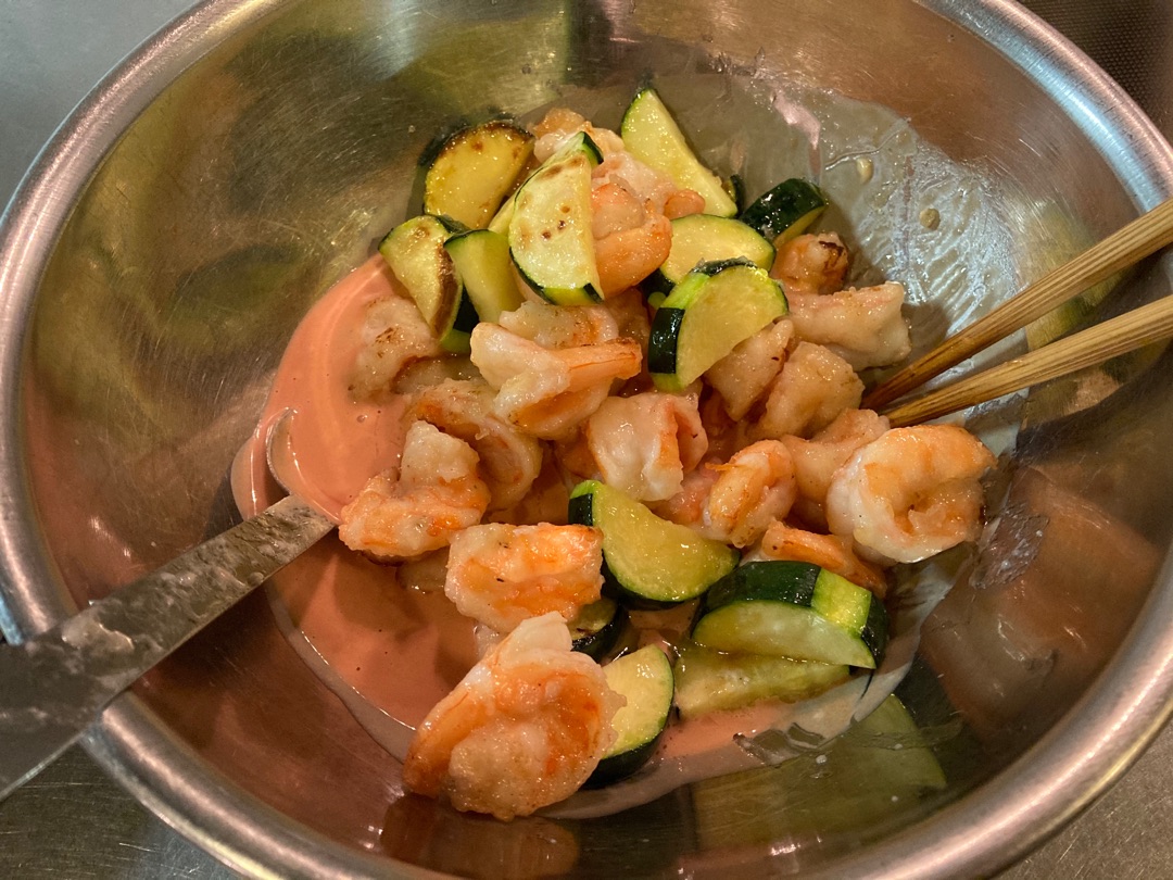 お安いバナメイエビを使っていますが、海老オンリーだとちょっと足りなさそうだったのでズッキーニでカサマシしました