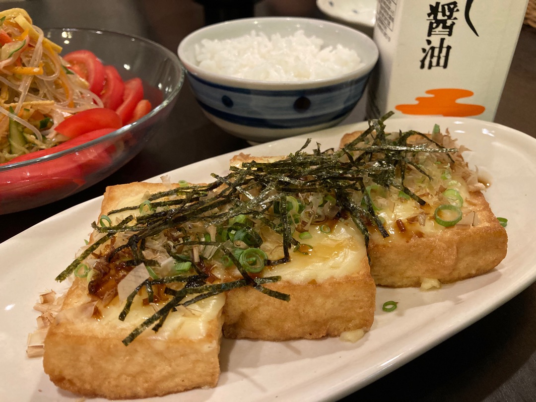 厚揚げは熱湯を回しかけて油抜きして、ピザ用チーズを乗せてオーブントースターで焼きます!