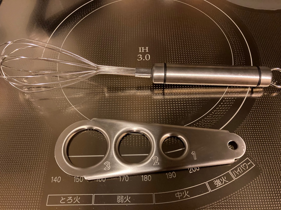 ほかにもこのステンレスの泡立て器が498円、パスタスケールが50円