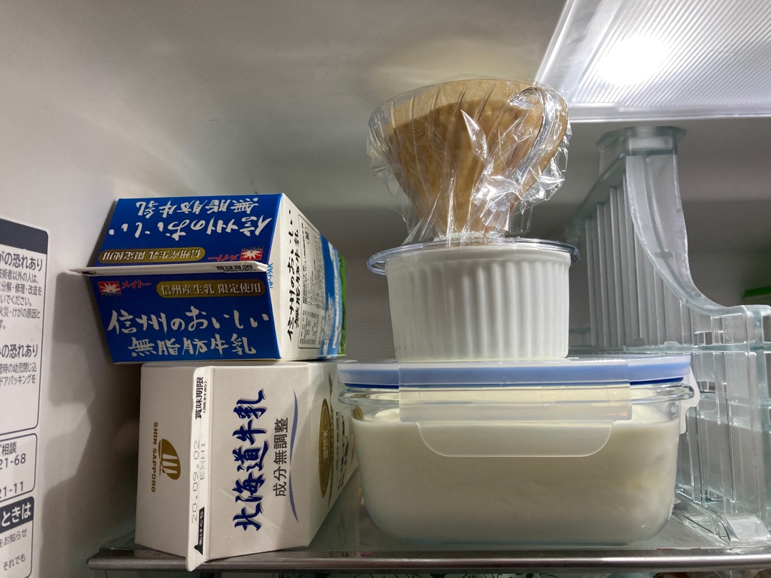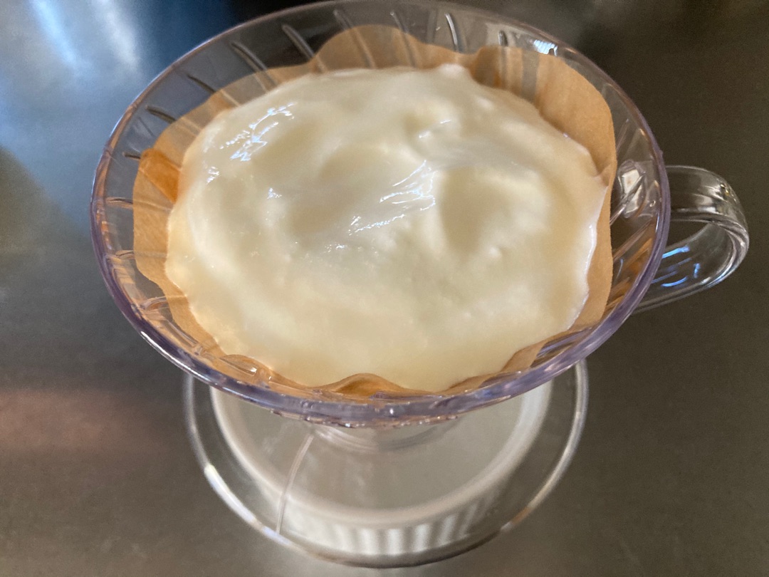 下にたまっているのはホエイというヨーグルトの上澄みです。これはタンパク質豊富なので捨てたらもったいない!