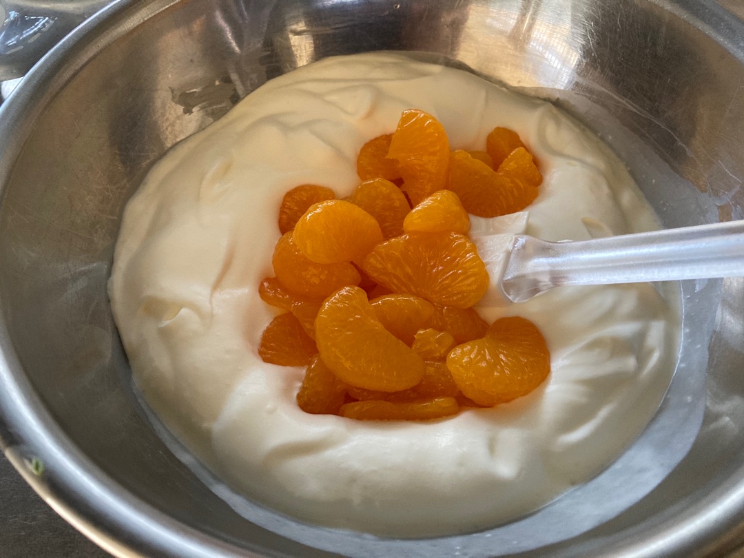 クリチは室温に戻して牛乳とまぜまぜ、生クリームは七分立てぐらいにして、みかん缶はシロップとみかんを分けておきます~♪^^