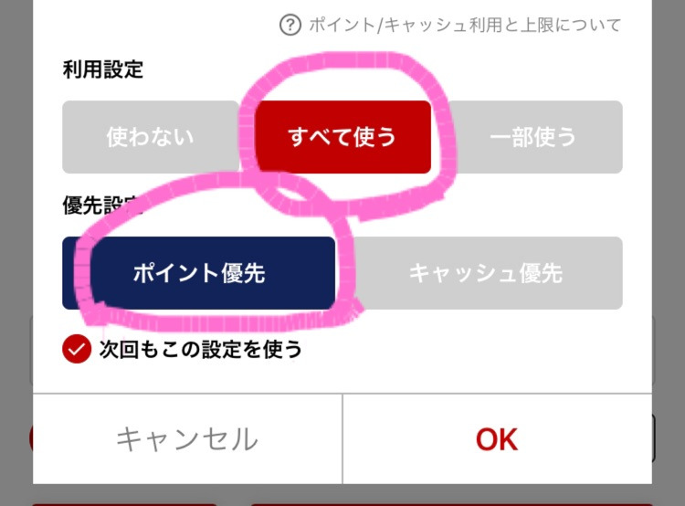 ここの「優先設定」のところを「ポイント優先」にしておくと、