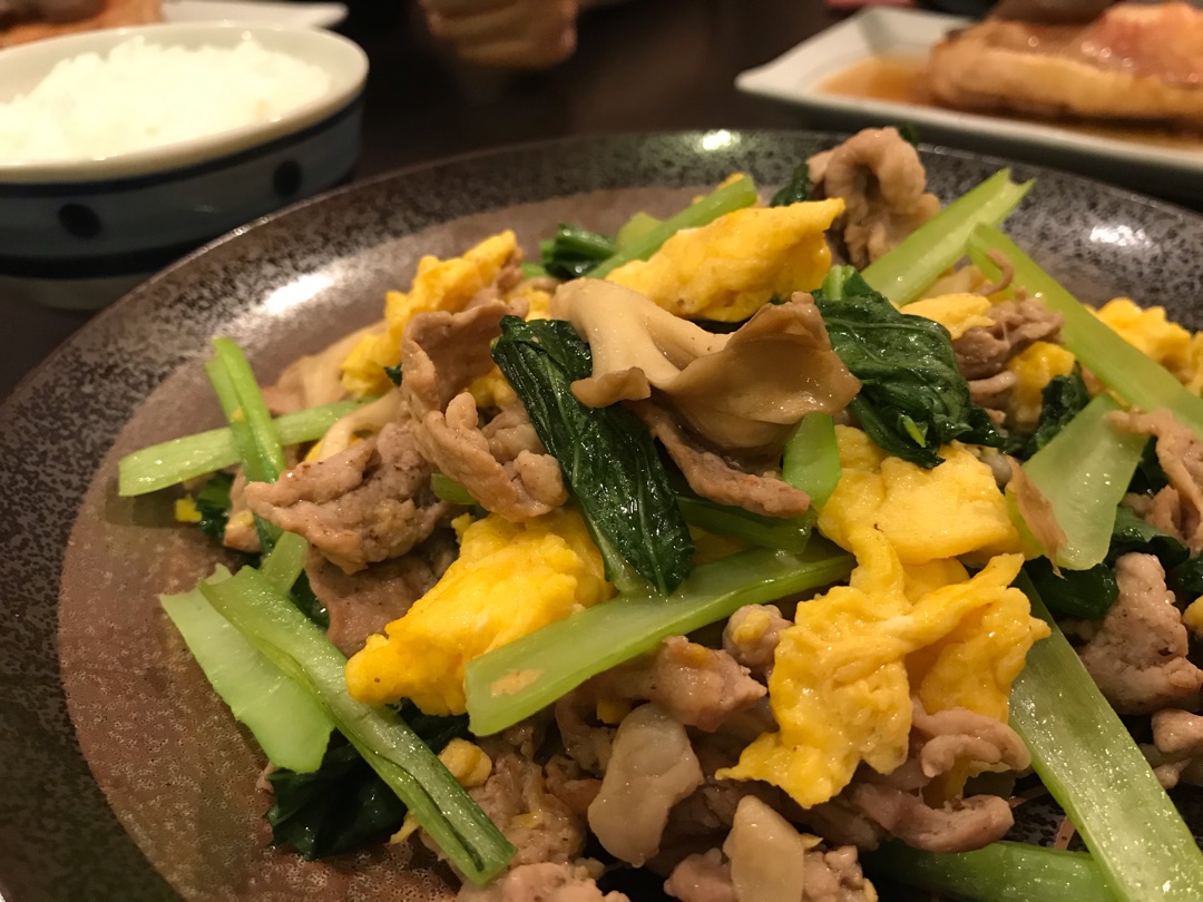 今回もメインは小松菜と豚肉の炒めものですが、マイタケと、彩りに卵も入れました