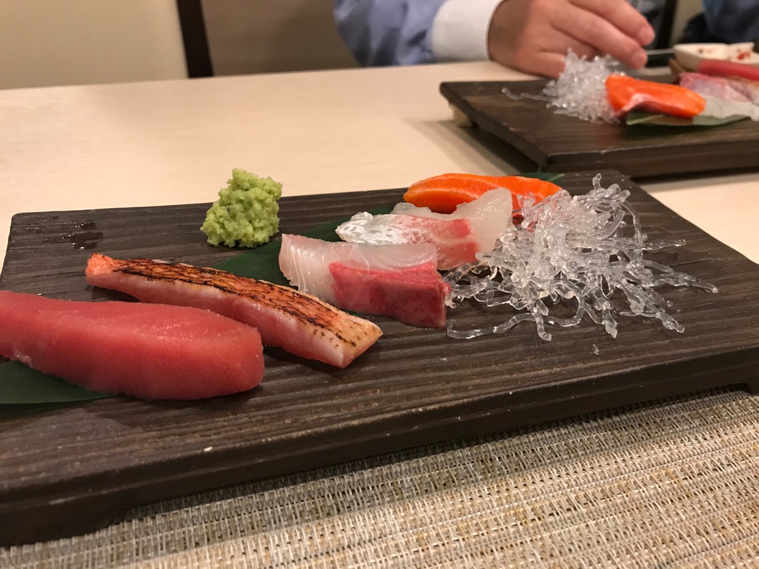 マグロ、金目鯛のあぶり、ブリ(ハマチ?)、鯛、そして絹姫サーモン(だったと思う)のお刺身!