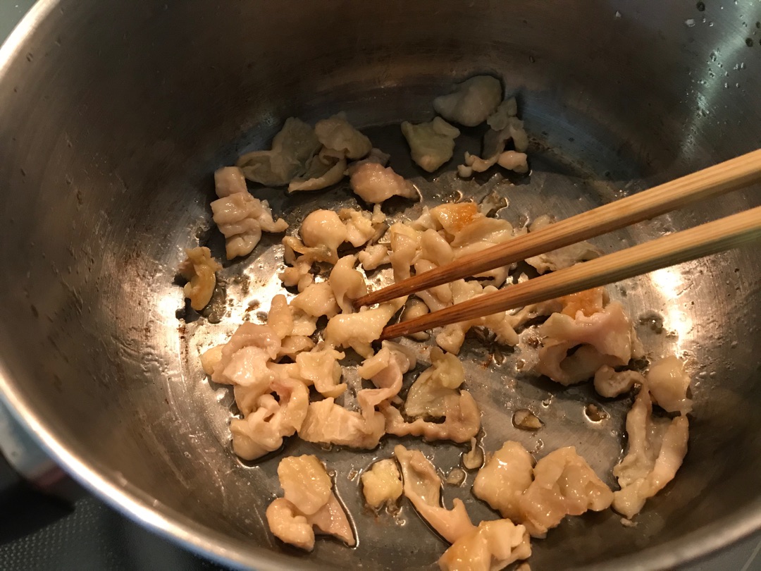 鶏皮を炒めるときはあまり箸で触らずに、鍋に入れて弱火でしばらくほったらかしにするほうが脂が出ます。
