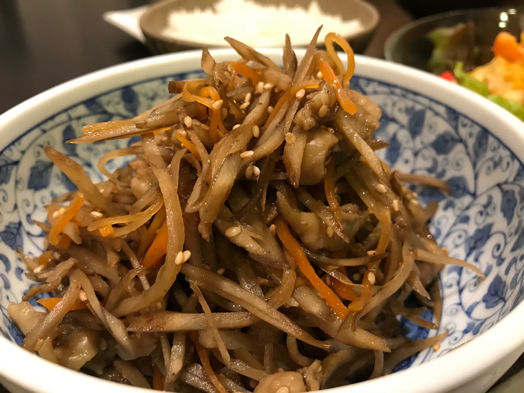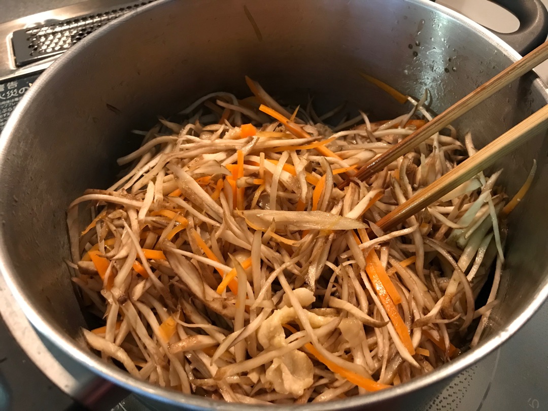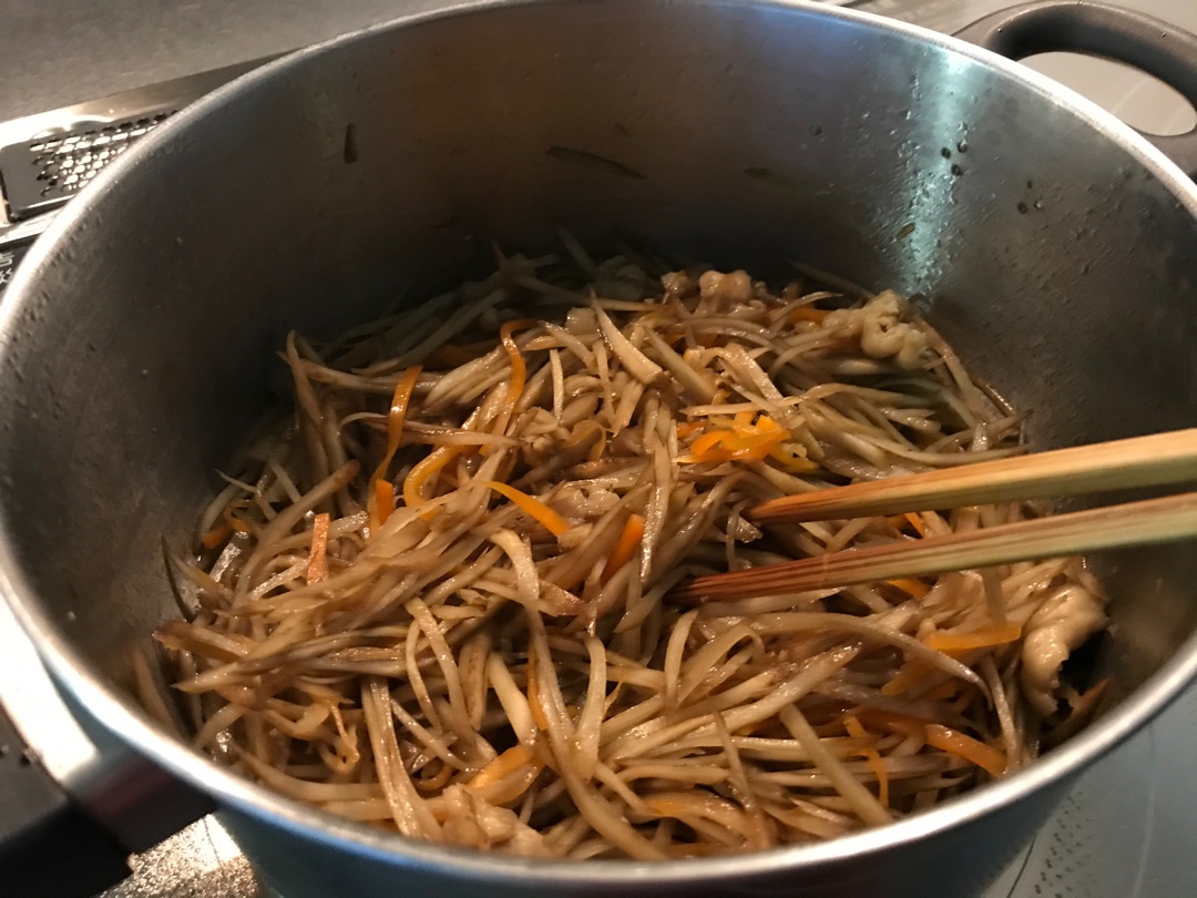 ごぼうを千切りにしている間に弱火でじっくり炒めると時短になります^^