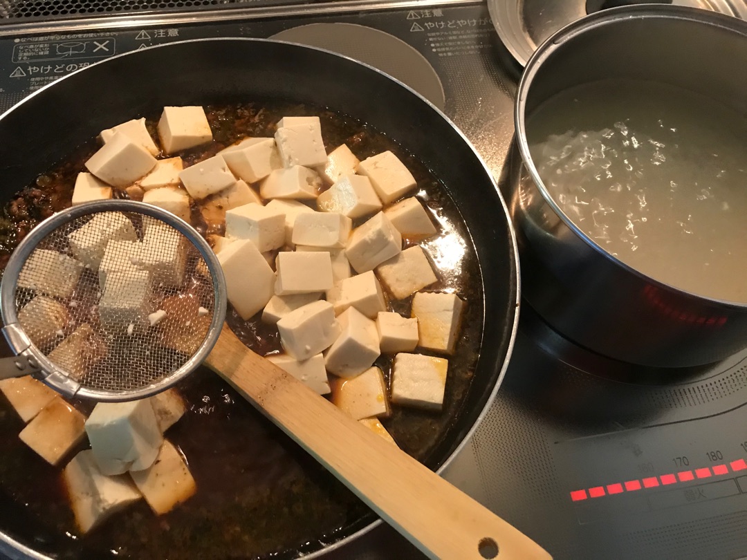 (この黒い粒々がそうです) 挽き肉炒めているときに隣では豆腐を茹でておきます!^^ 茹でた豆腐は、私はこのようにアミですくって隣のフライパンに引越しさせています^^