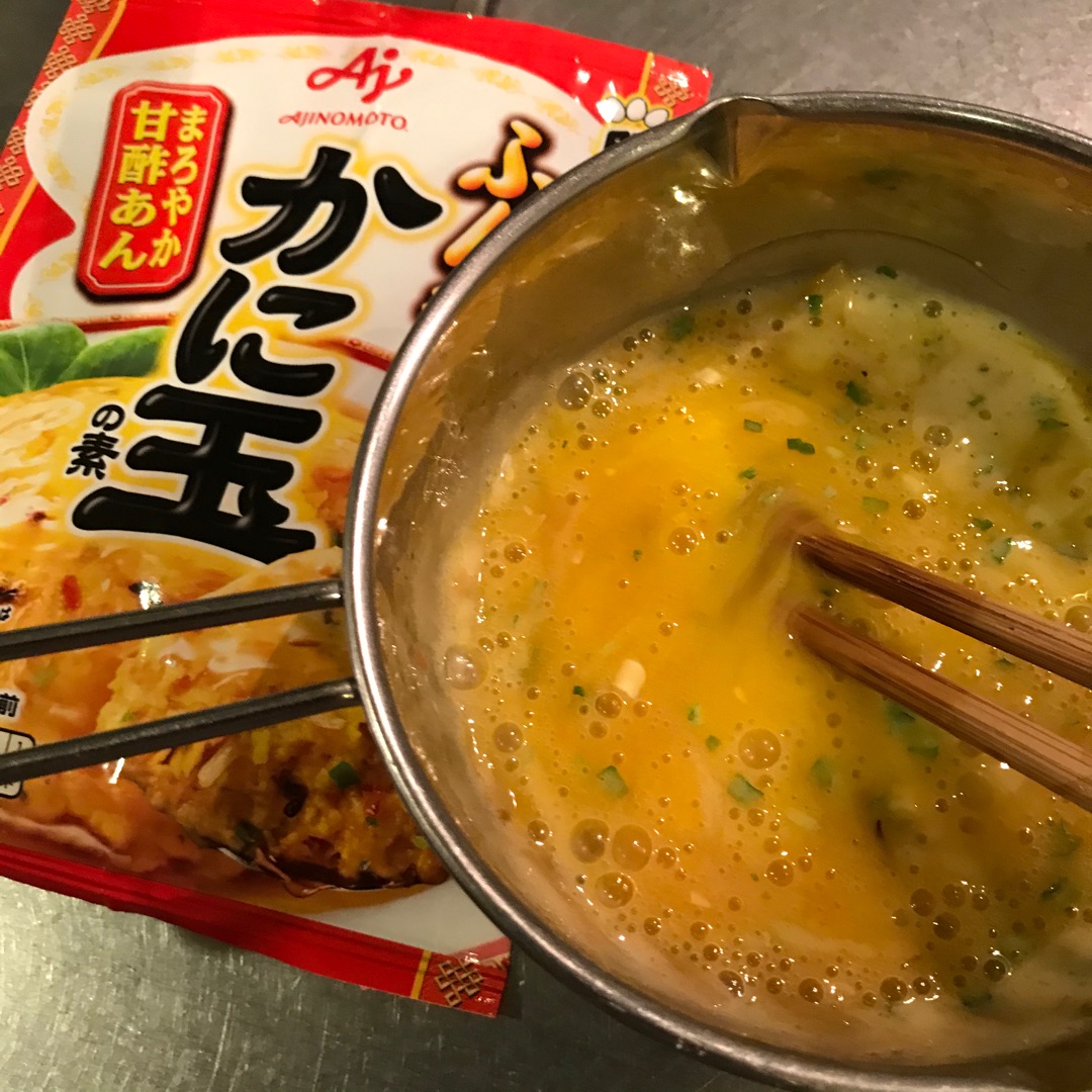 最初にこのふんわり粉とカニ玉の素(具)?を混ぜておいて、ここに卵3個を入れてまぜまぜ♪^^