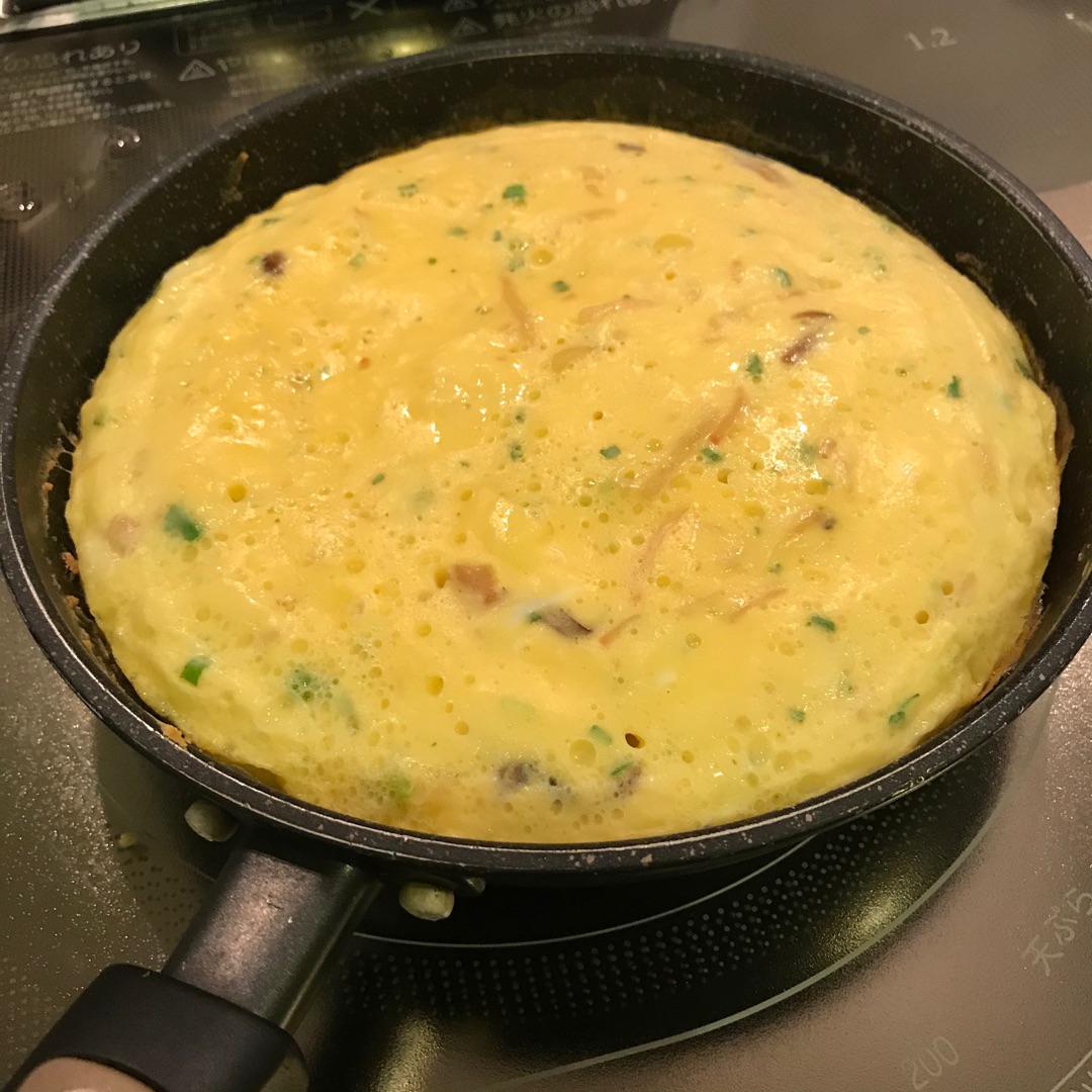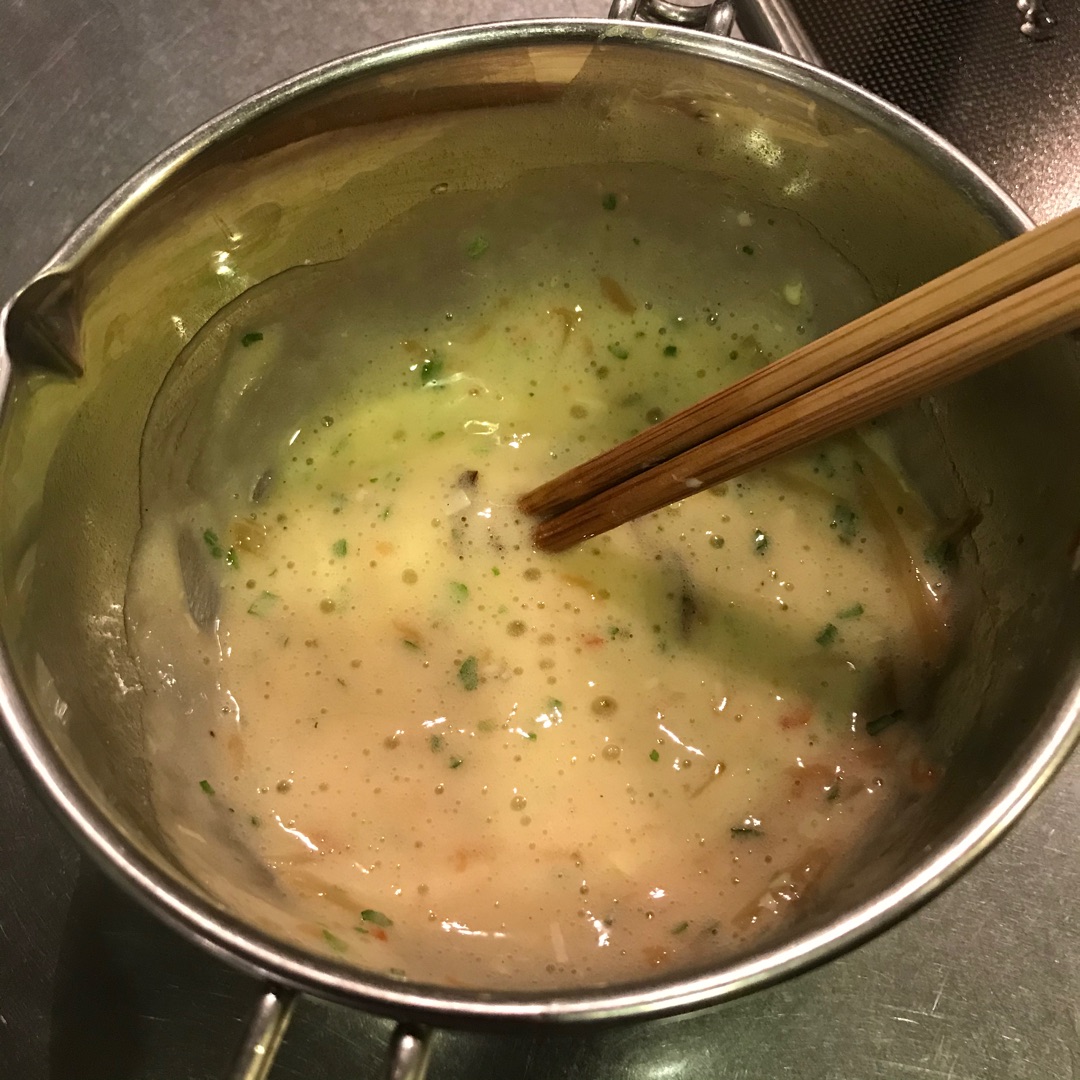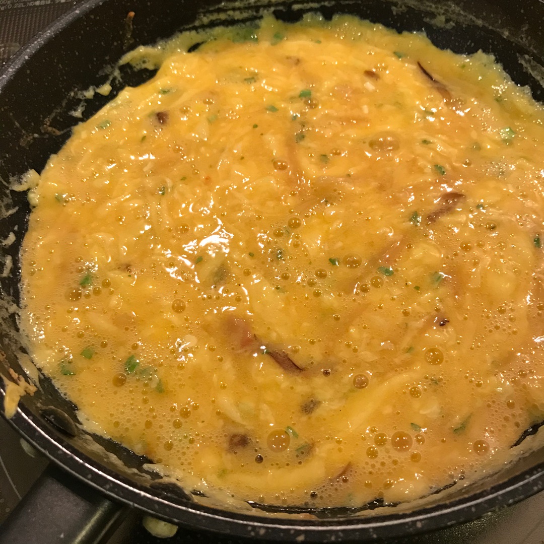 フライパンは前後に揺らしながら菜箸はグルグル回すと早く半熟になります