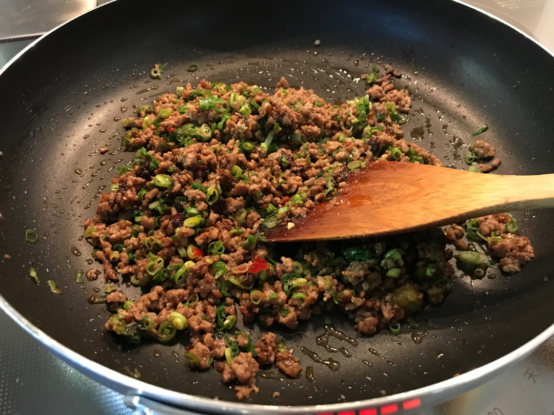 挽き肉をパチパチと音がするくらいまで、みじん切りのニンニク&しょうがとよーく炒めます。