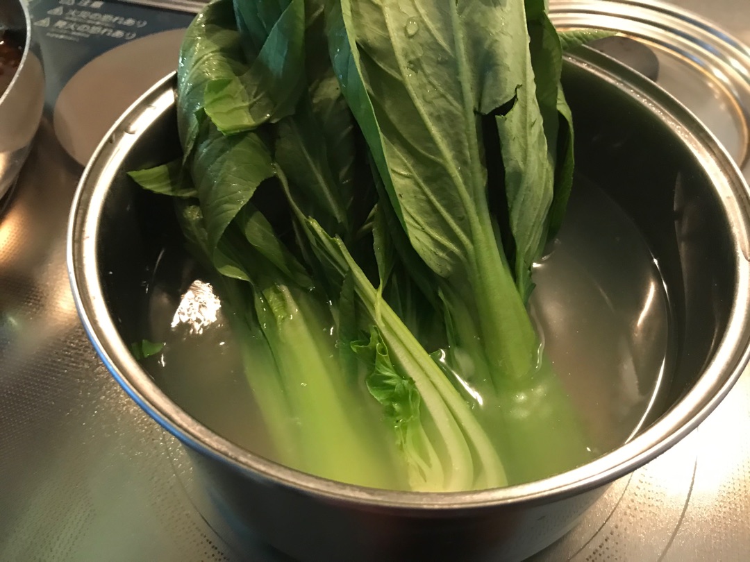 ちなみに、周りのチンゲンサイは、さっきの麻婆豆腐の豆腐を茹でた後の鍋でついでに茹でておくと手間ナシ!