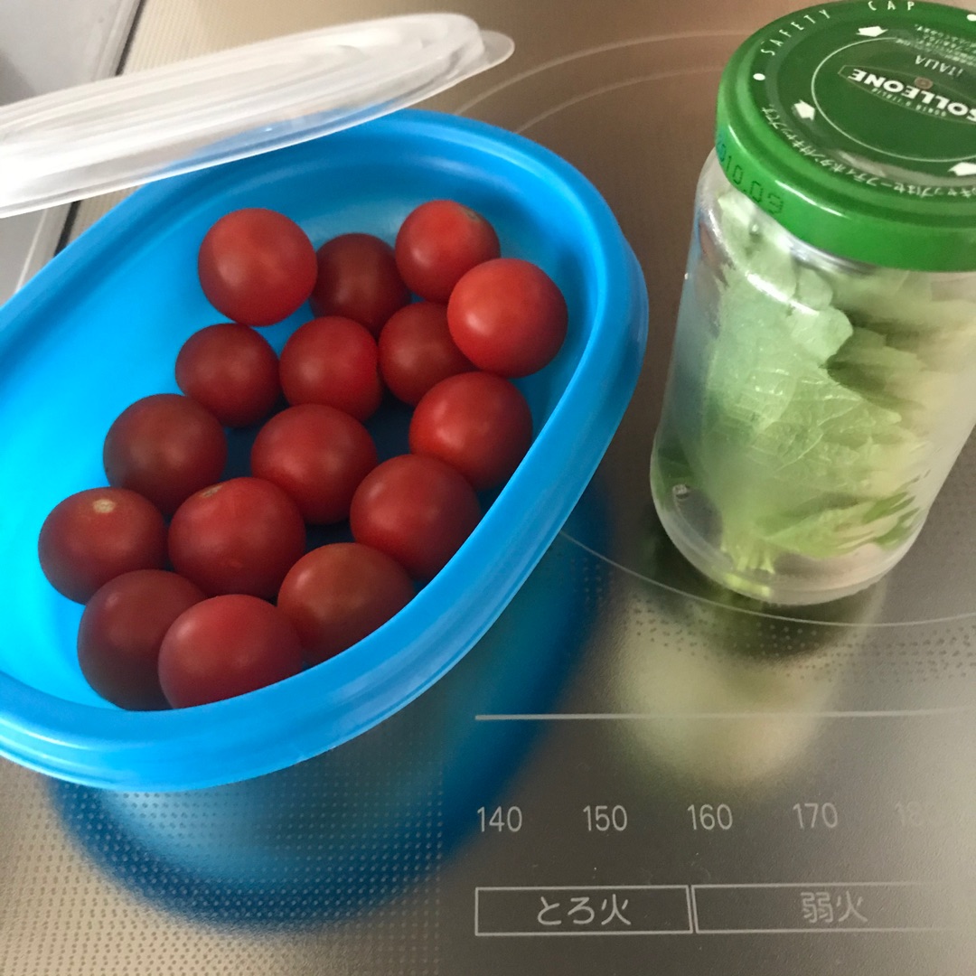 下ごしらえというほどでもないけど、プチトマトと大葉はこんな感じ。