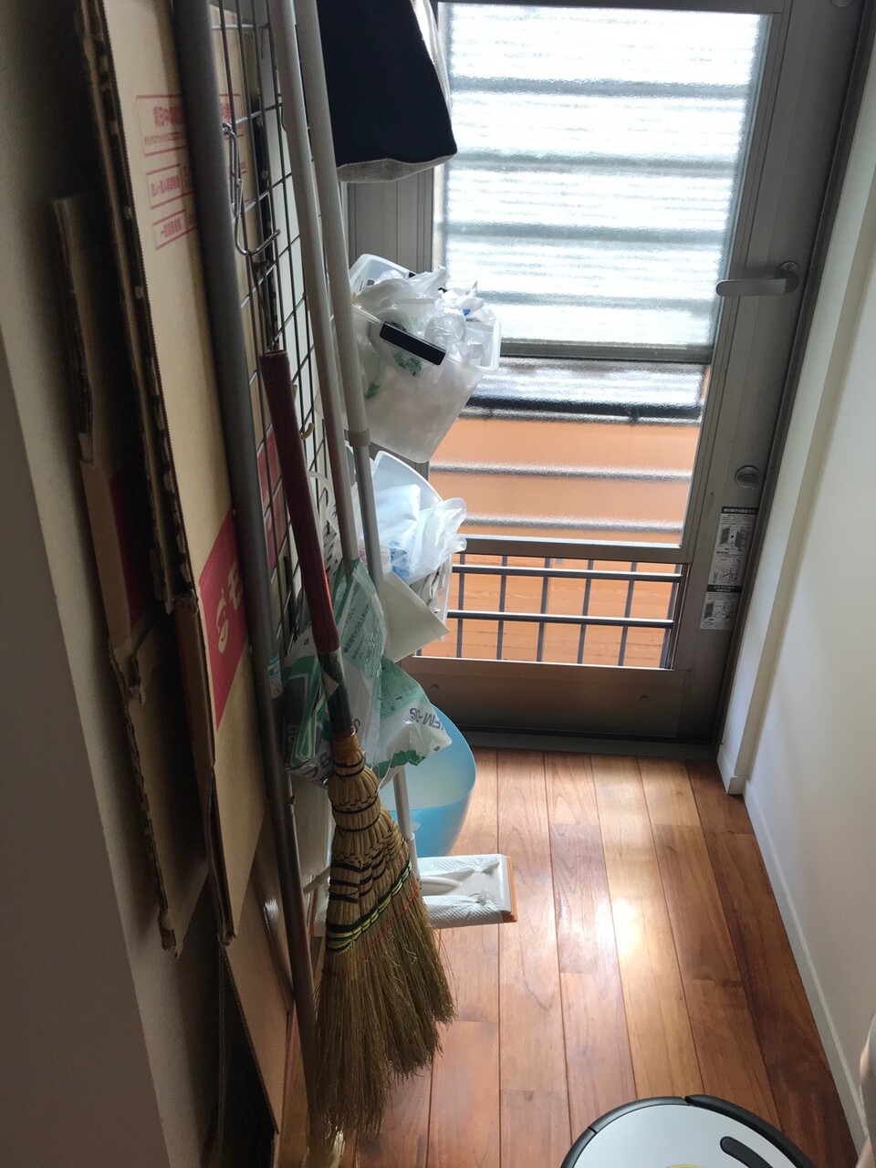 ちなみにフローリングワイパーは汚れたらすぐに使えるように・・・ 壁際につっぱりネットをしてお掃除用品をまとめています。汚くてすいません