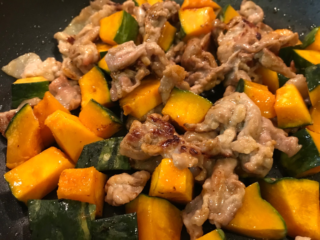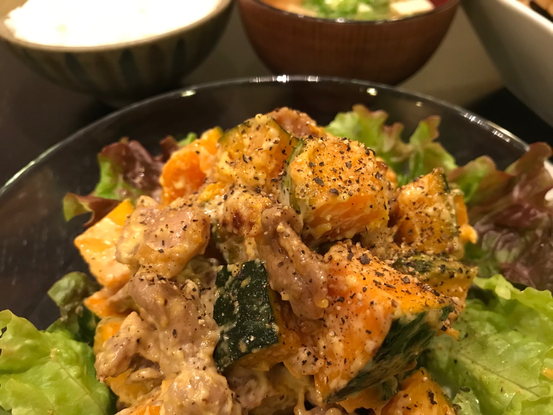 いつものマッシュにするかぼちゃサラダとは違い、コロコロのかぼちゃと豚肉のサラダなんですが、