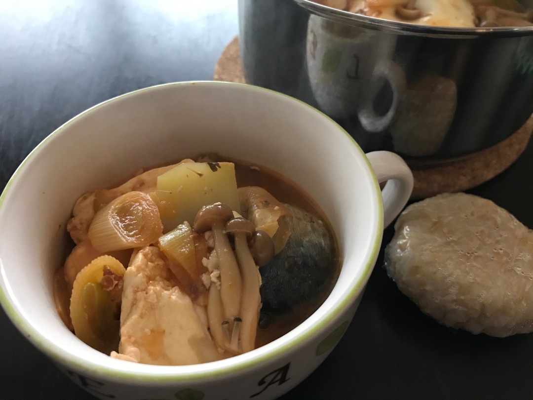 昨日のひじきの煮物も残っていましたが、今日は少し肌寒かったので、サバ缶を使った一人キムチ鍋にしました