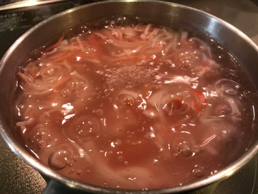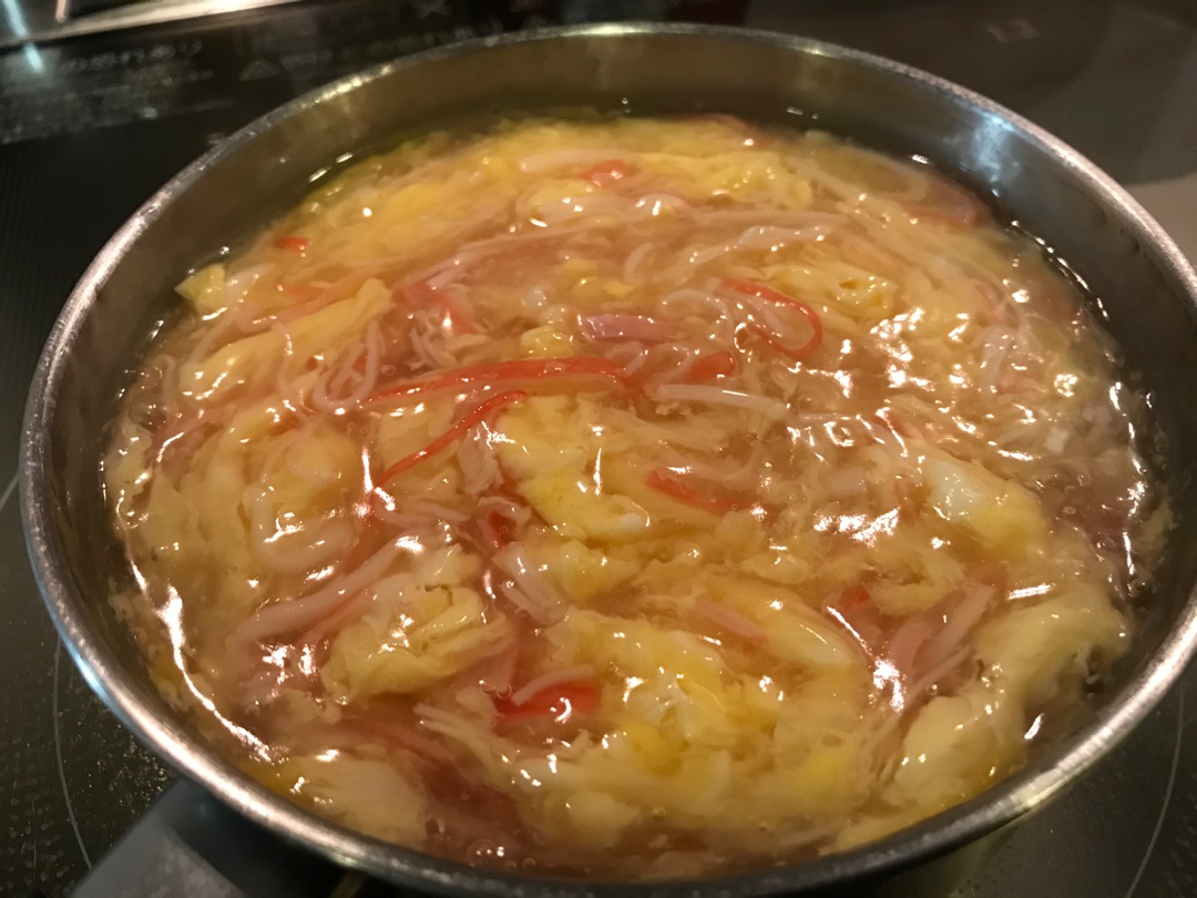 まず、小鍋に鶏ガラスープをつくってカニカマを細く割いて投入~^^