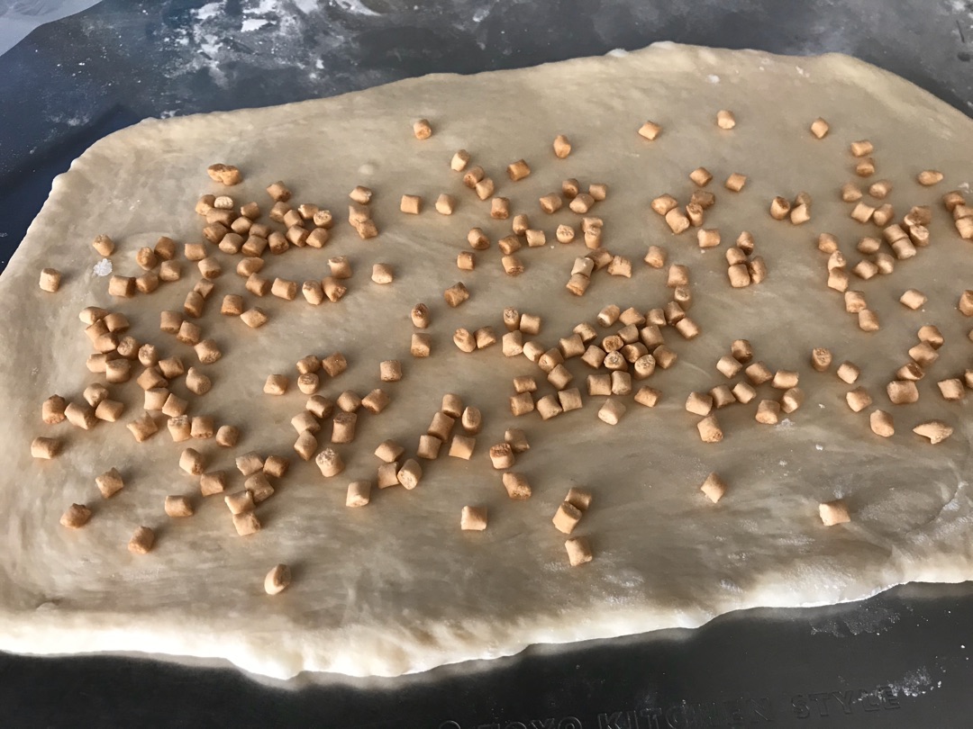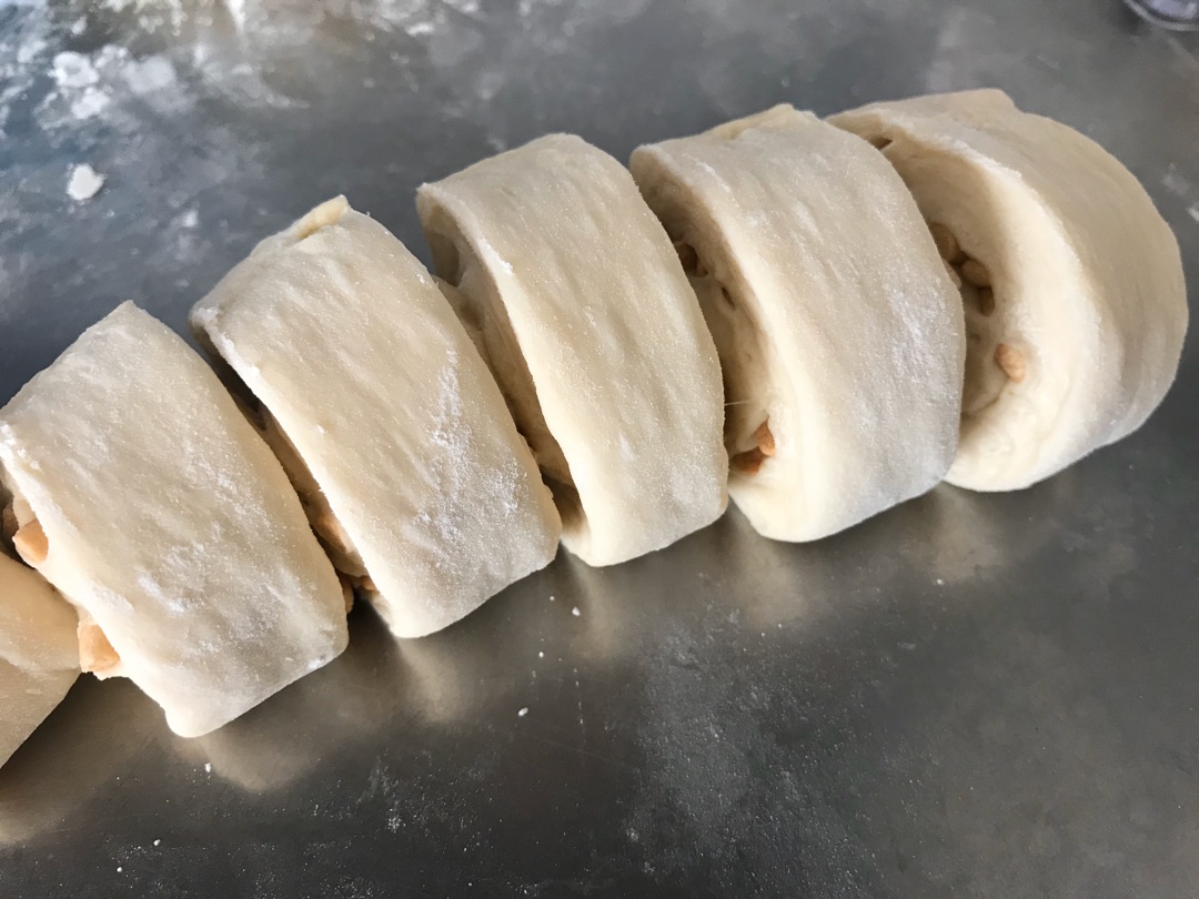 で、粒ジャムを伸ばした生地の上においたら、軽くめん棒をかけて粒ジャムを上から押さえてからくるくる巻きます。