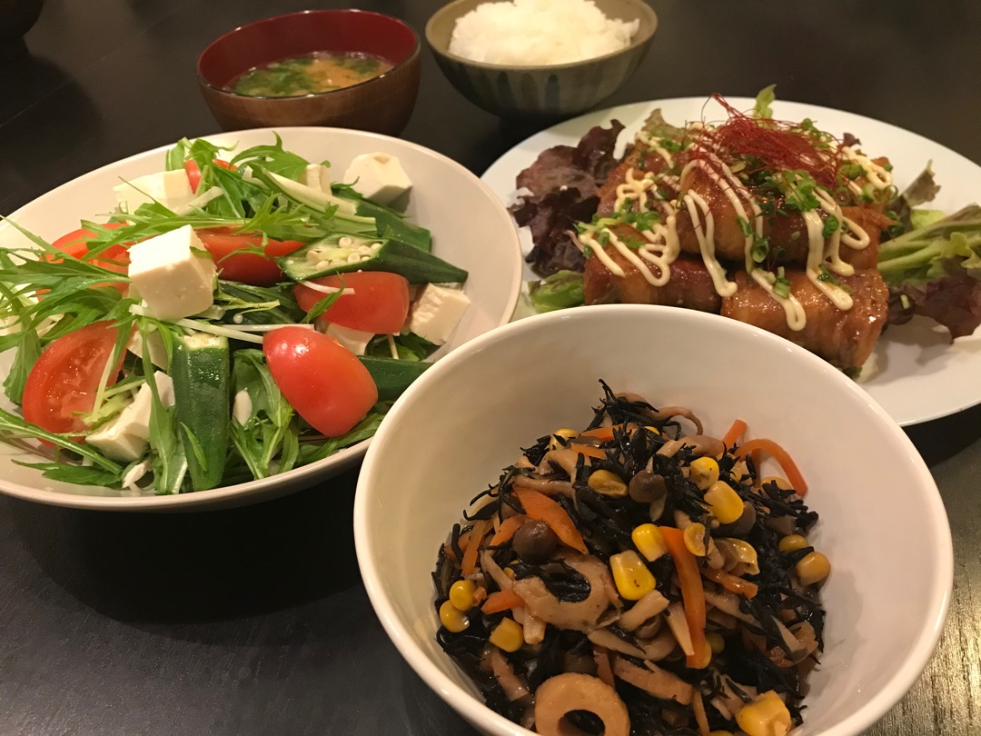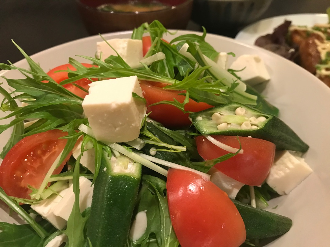 サラダは水菜と豆腐とオクラ、トマトのサラダ。
