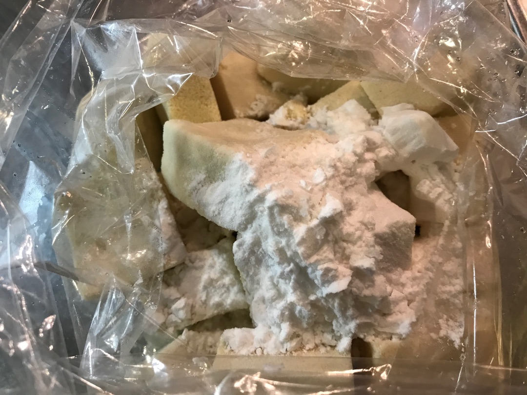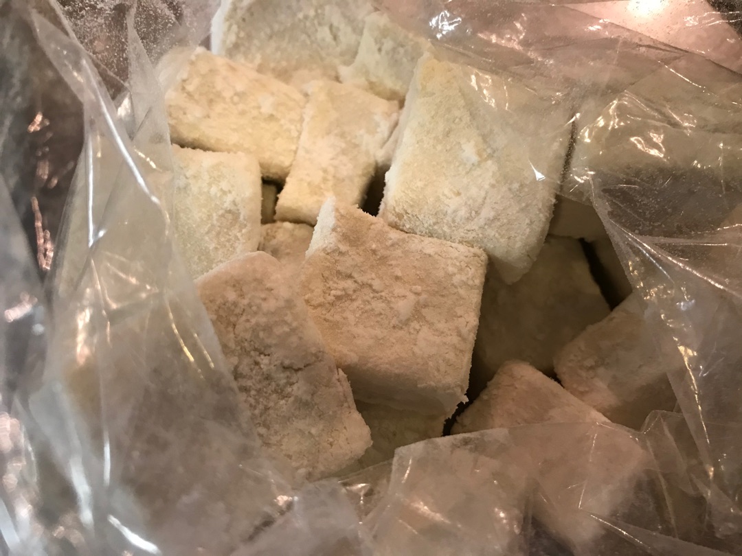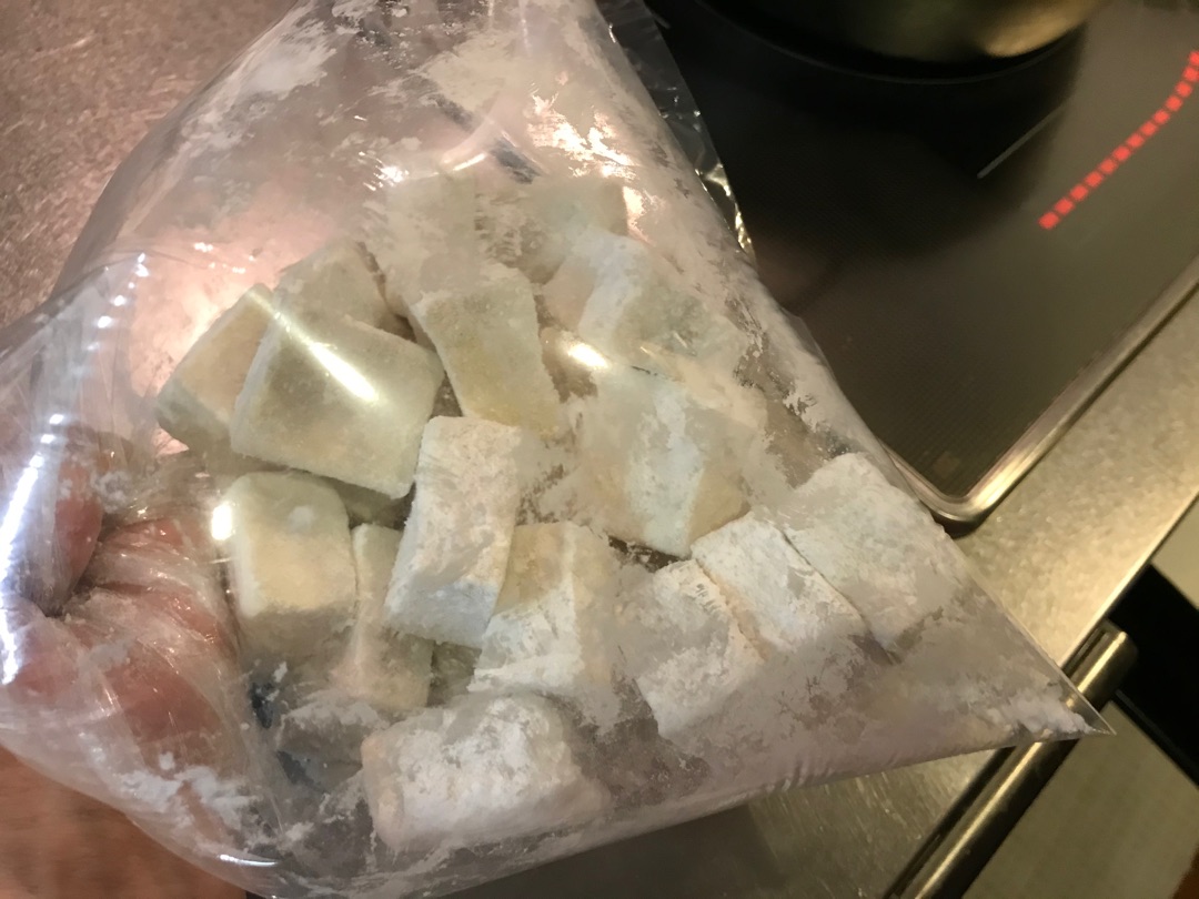 このとき片栗粉がついていない部分があると、この後油で揚げたときに油を吸ってしまっておいしくないので、ちゃんと粉がついているかよく確認してくださいねー!